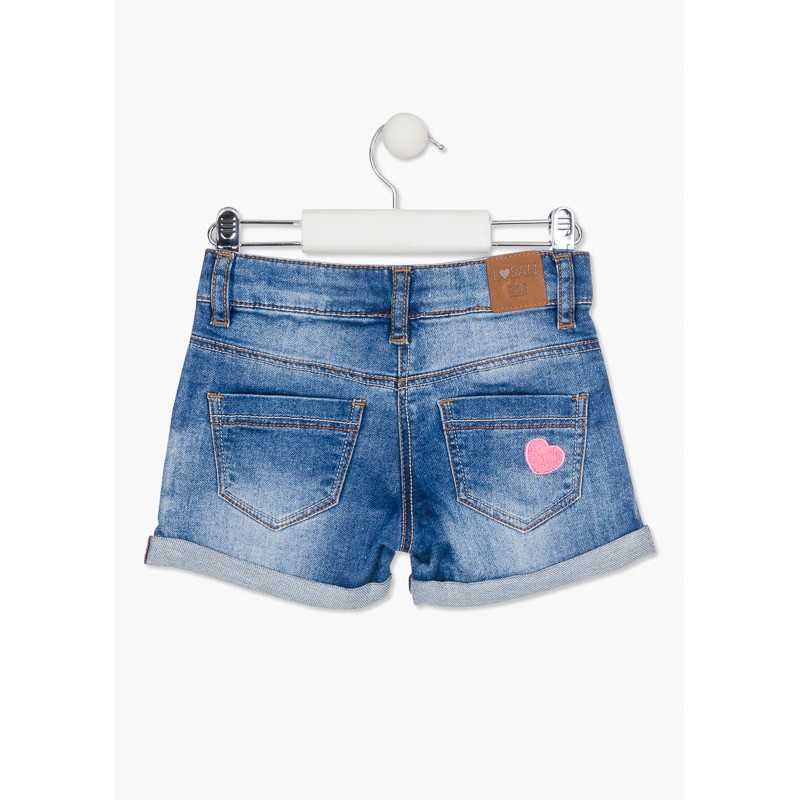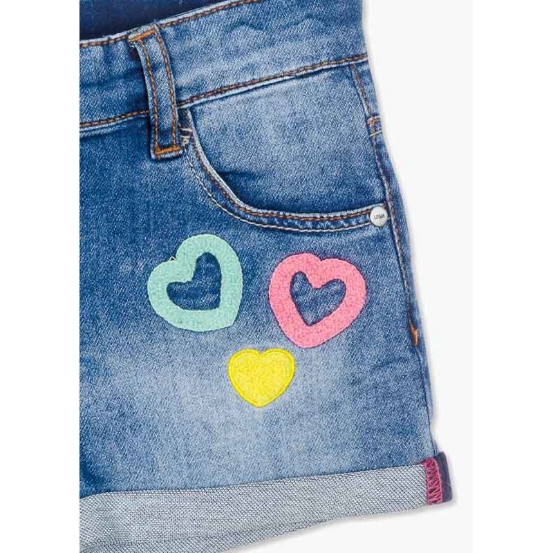 Short vaquero de felpa con corazones para niña. Short con parches de rizo. Vuelta en el bajo. Cierre con botón y cremallera. Trabillas en la cintura y ajustador interior de goma. Etiqueta de marca en al cintura posterior.