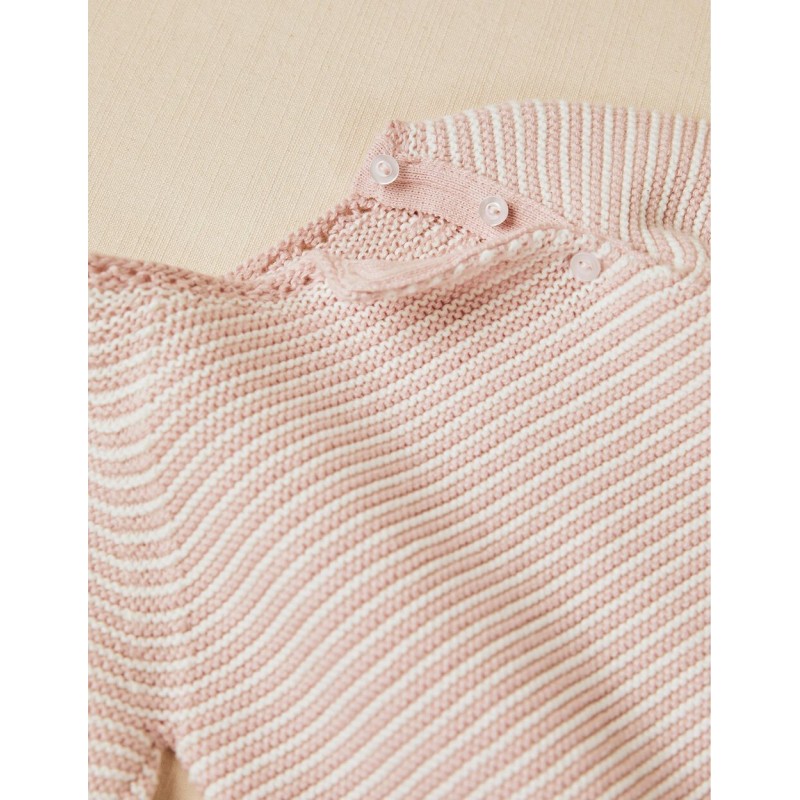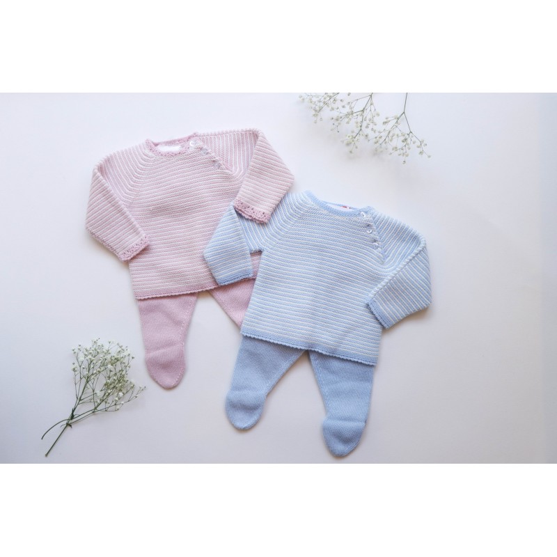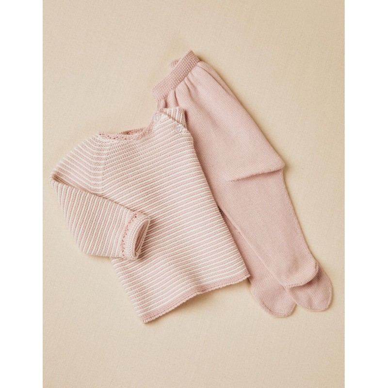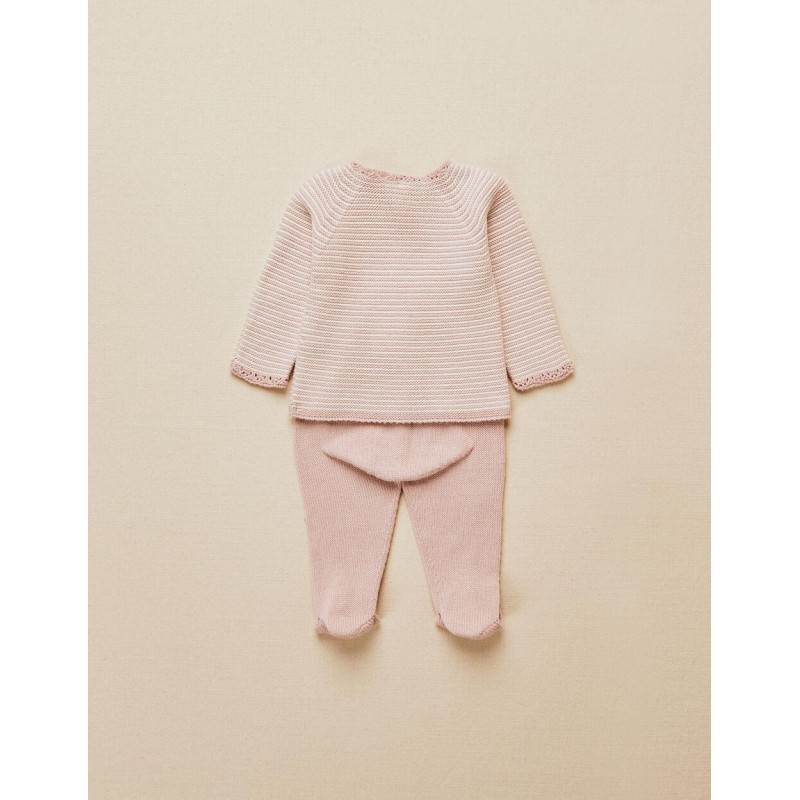 Conjunto de chaqueta y pantalón completos de punto 100% algodón para recién nacida sin costuras. Jersey con detalles de ganchillo y botones junto al cuello, para vestir con facilidad. Pantalón con cintura ligeramente elástica.