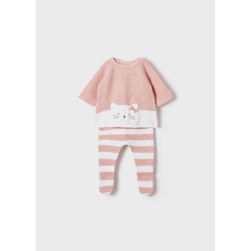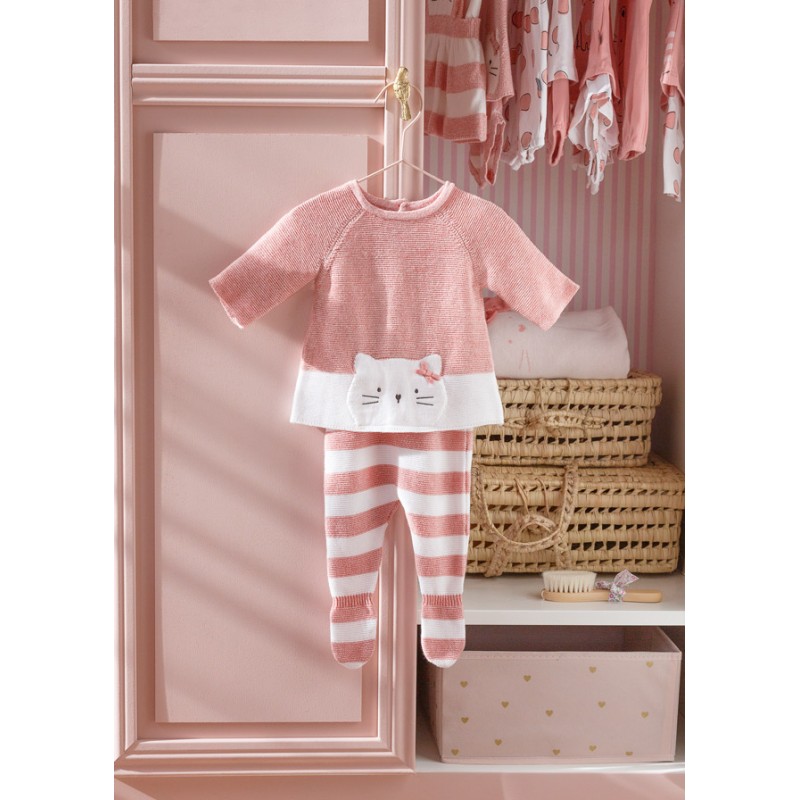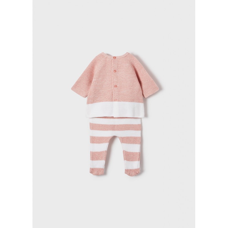 Prenda ECOFRIENDS 100% algodón orgánico. Este conjunto tricot de dos piezas para recién nacida niña incluye un jersey con polaina a juego.