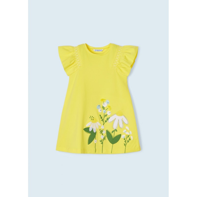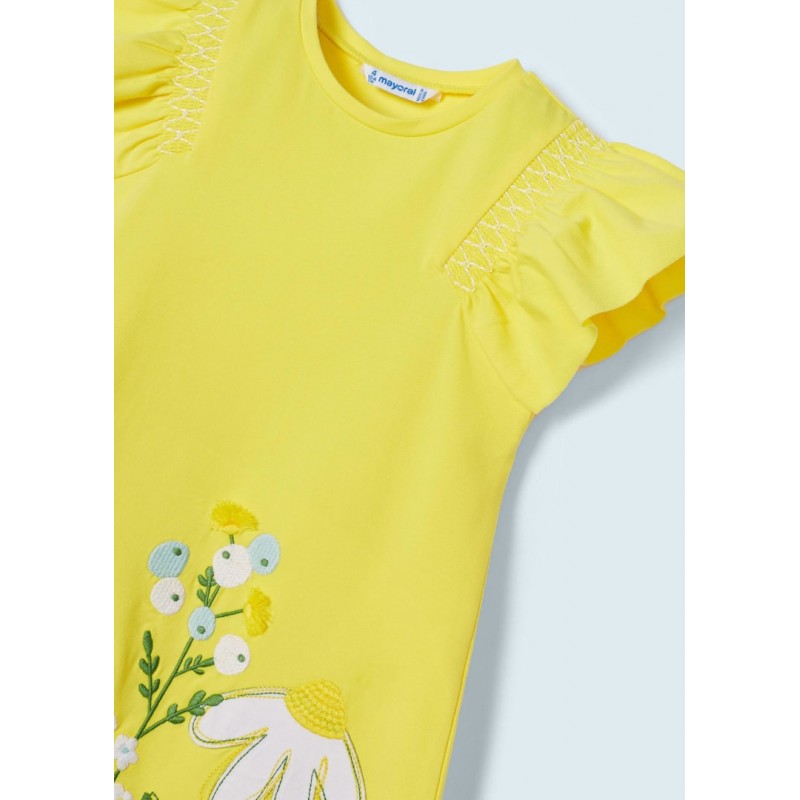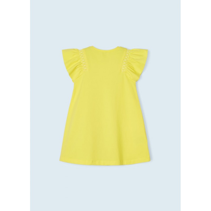 Vestido de manga corta para niña con detalles de volantes. Cuello redondo. Suave tejido de algodón elástico. Elementos de adorno: bordados.
