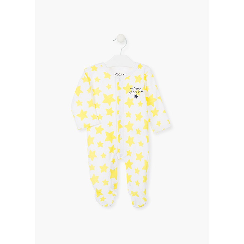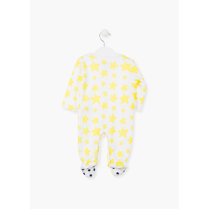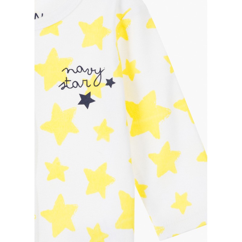 Pijama estampado de estrellas. Pijama de color blanco con estampado amarillo. Con vivo en el cuello. Abertura con automáticos en todo el delantero y entrepiernas. Con estampado engomado de estrellas azules en los pies. Con goma ajustadora en tobillos. Presentado en cajita.