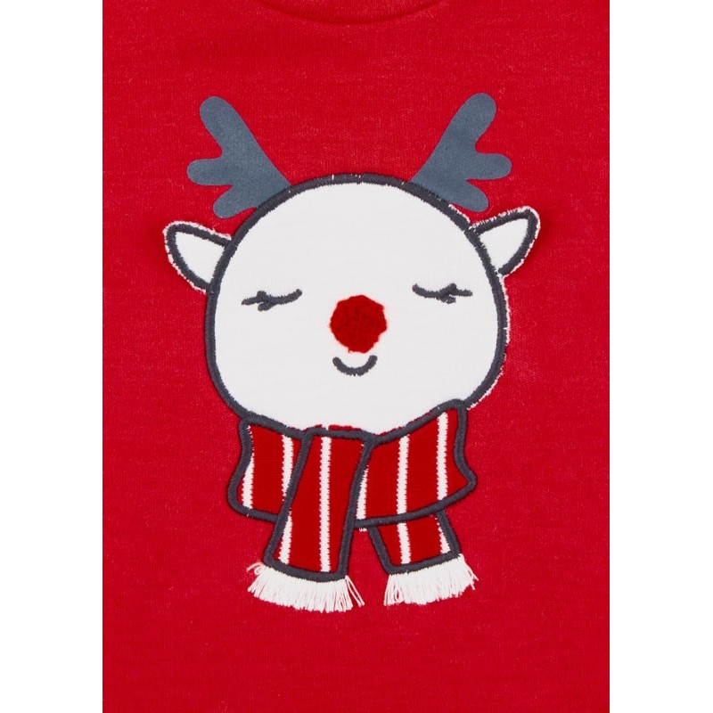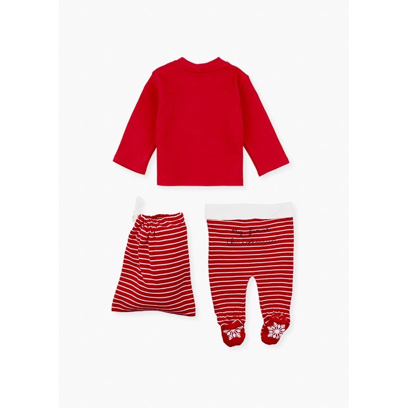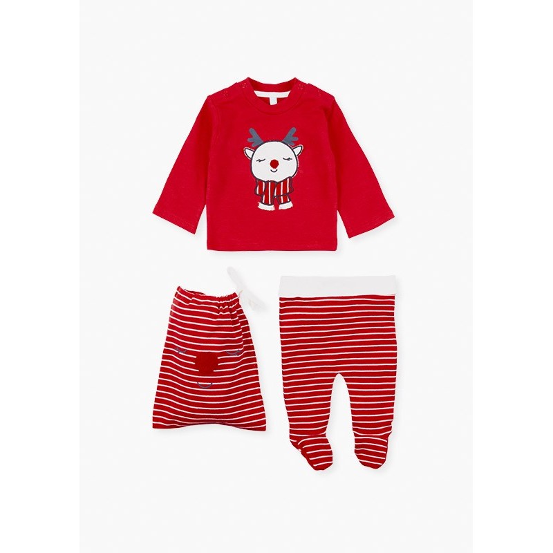 Conjunto navideño de sudadera y pantalón para recién nacido niño. Conjunto de tres piezas. Sudadera en tejido de interlock perchado efecto melocotón al tacto de color rojo con reno estampado. Pantalón en tejido de interlock efecto melocotón al tacto a rayas con estampado trasero y estampado antideslizante en pies. Con bolsita.