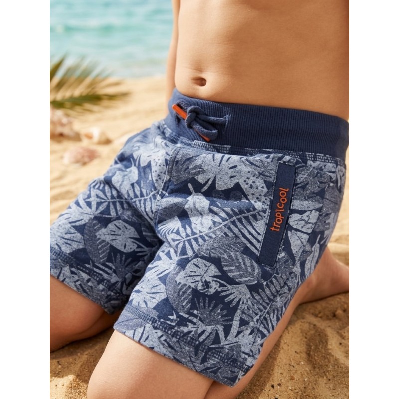 Bermuda con estampado tropical para niño. Bermuda de punto de color azul con bolsillos delanteros. Bragueta simulada. Cinturilla en tejido de canalé con cordón ajustador. Bolsillo trasero.