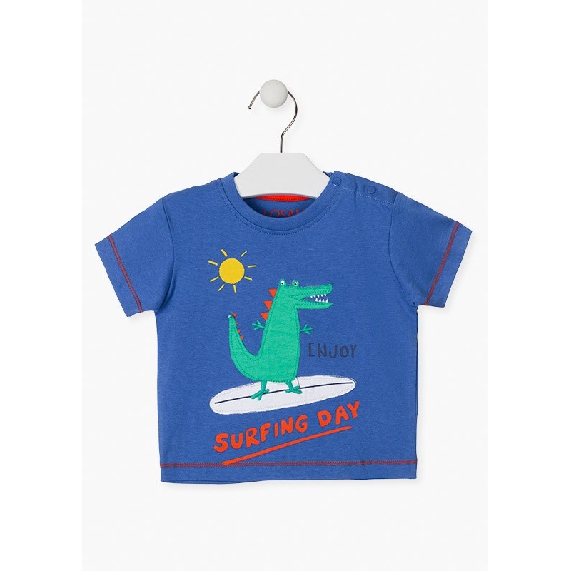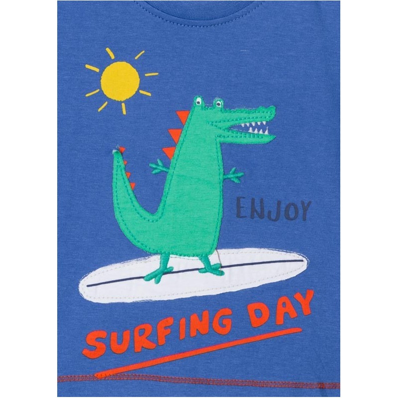 Camiseta en color azulón con estampado para bebé niño. Camiseta de algodón de manga corta con cuello redondo de tejido de canalé. Con parche en forma de cocodrilo y tabla de surf en el delantero. Con abertura en hombro con automáticos y con pespuntes a contraste en bajos y mangas.
