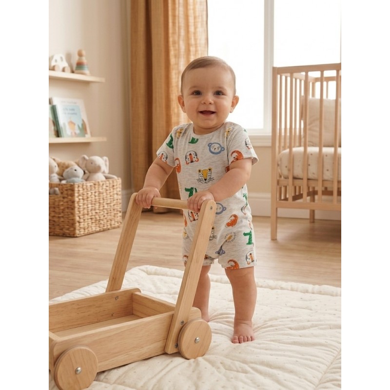 Enterizo de punto con manga corta para bebé niño. Enterizo estampado con caras de animales salvajes.