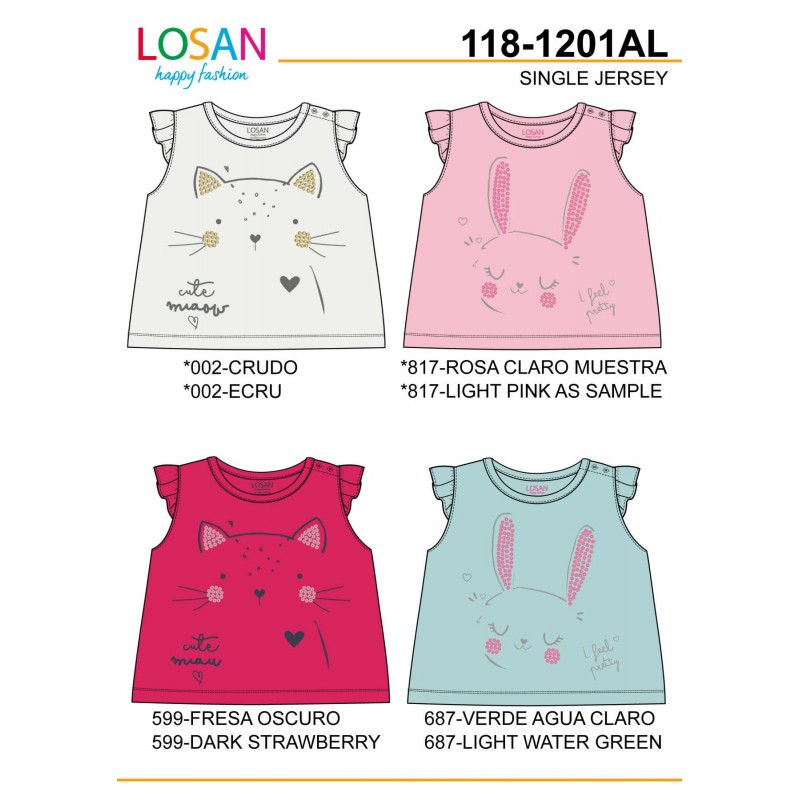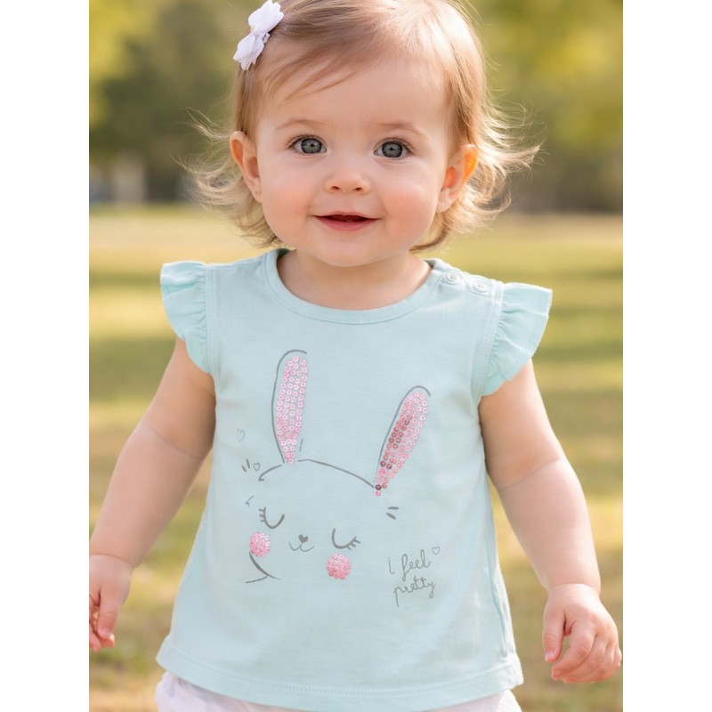 Camiseta con gatito para bebé niña. Camiseta de tejido de algodón con volantes en las mangas. Impresión de lentejuelas sintéticas. Cuello redondo. Abertura en el hombro con botones. Disponible en varios colores y modelos.