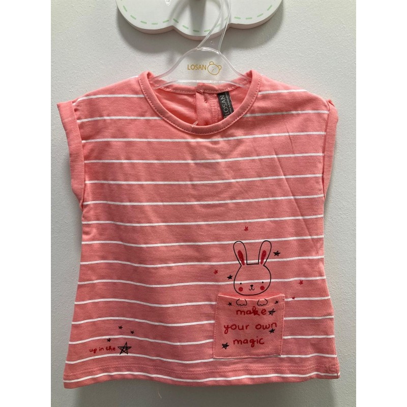 Camiseta para bebé niña. Camiseta de tejido de algodón con manga corta, estampado a rayas. Cuello redondo.