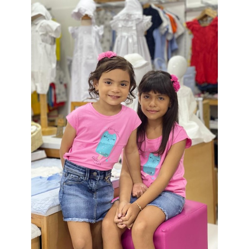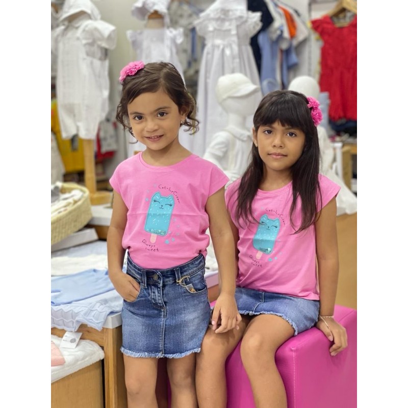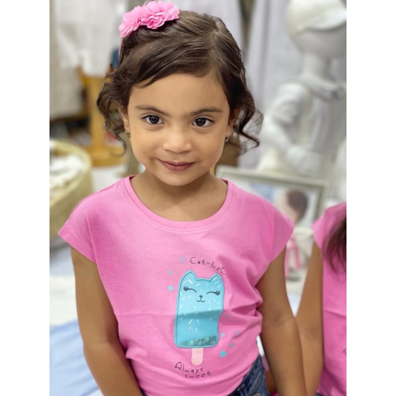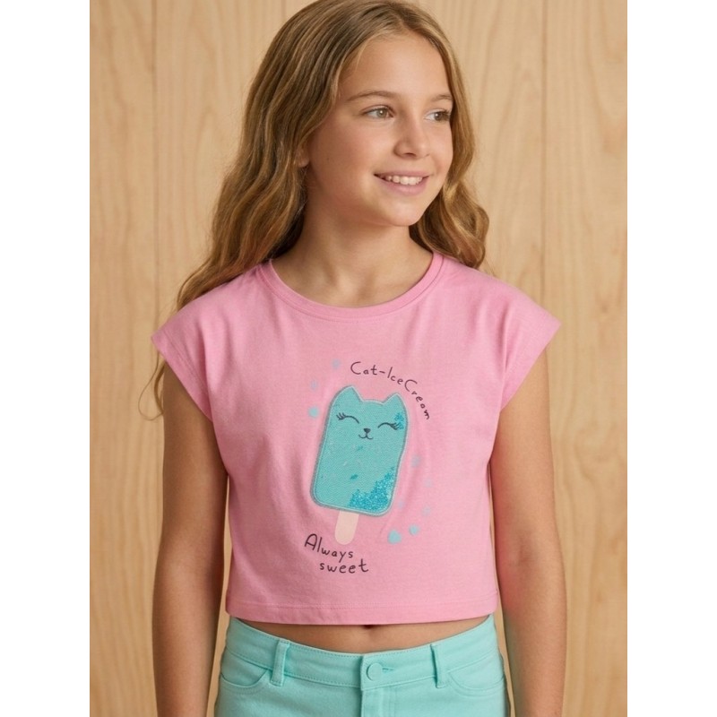 Camiseta con parche de tul con lentejuelas para niña. Camiseta con estampado. Cuello redondo y manga corta.