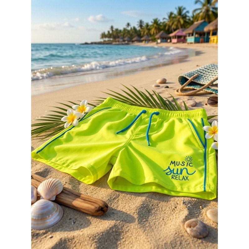 Bañador de microfibra con mensaje para niño. Bañador con cintura elástica. Bragueta simulada. Cordón ajustador en la cintura.