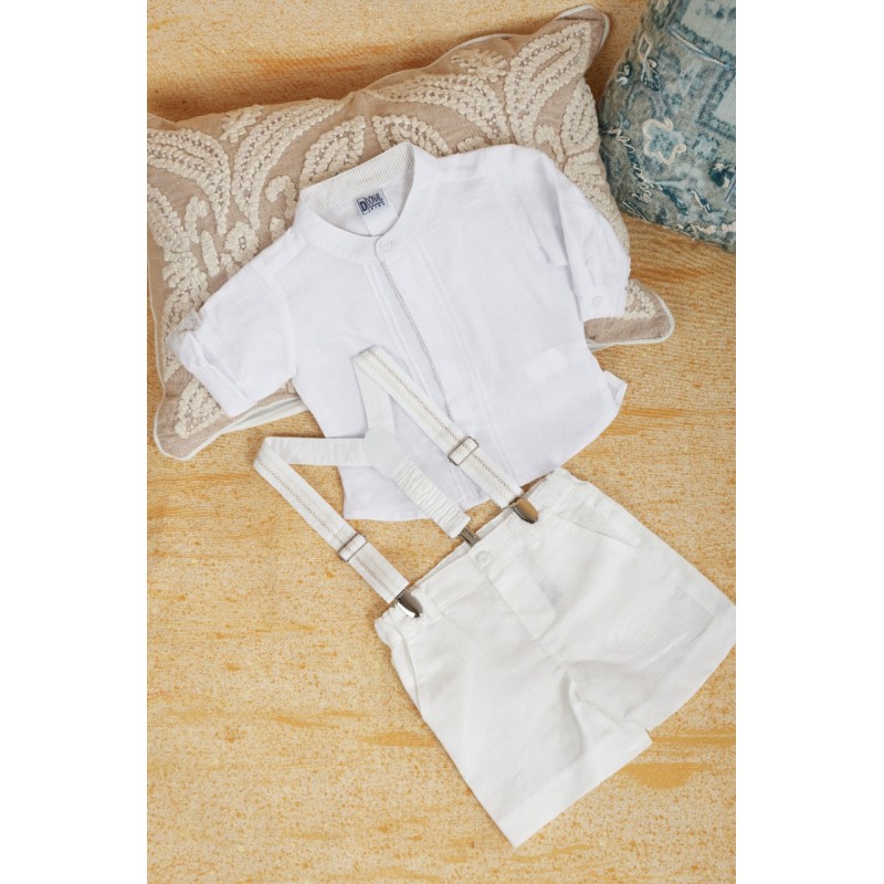 Conjunto para niño, elaborado en fino lino, Camisa manga larga que se puede usar tres cuartas, cuello mao, bermuda y cargaderas.