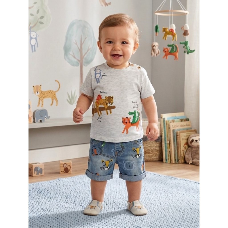 Conjunto de camiseta de manga corta y bermuda denim 117-8016AL LOSAN. Conjunto de camiseta de punto en color blanco hielo con animales estampados y frases.