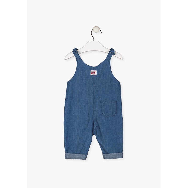 Mono largo en tejido vaquero para bebé niña. Mono de tirantes en tejido de algodón con abertura delantera con botones. Dos bolsillos delanteros y un bolsillo en la parte posterior. Vuelta en el bajo. Lazo decorativo en los tirantes.