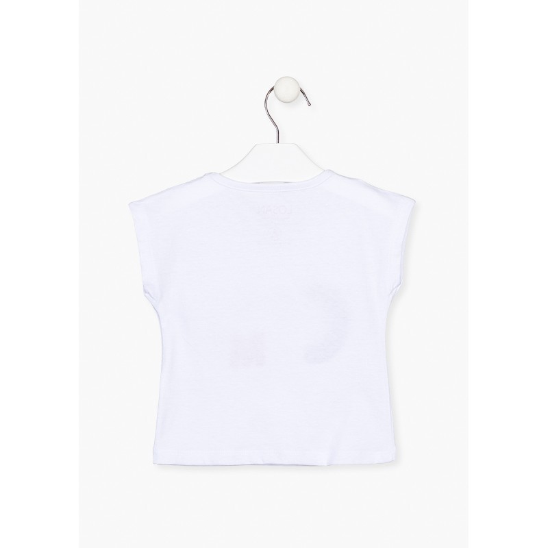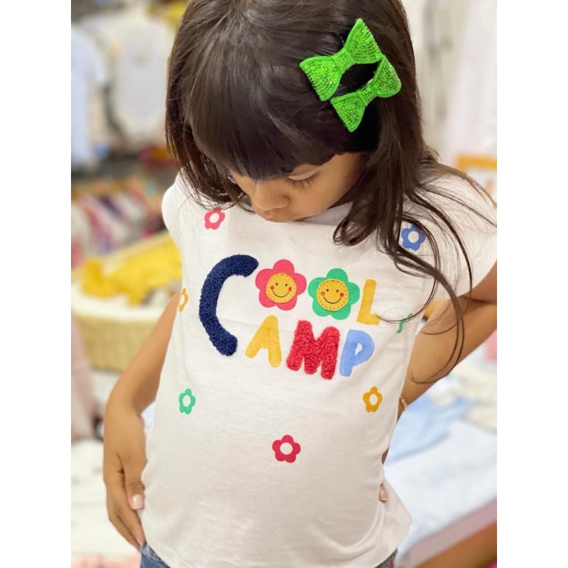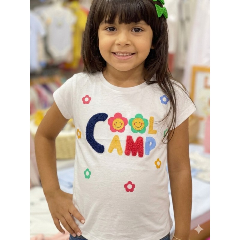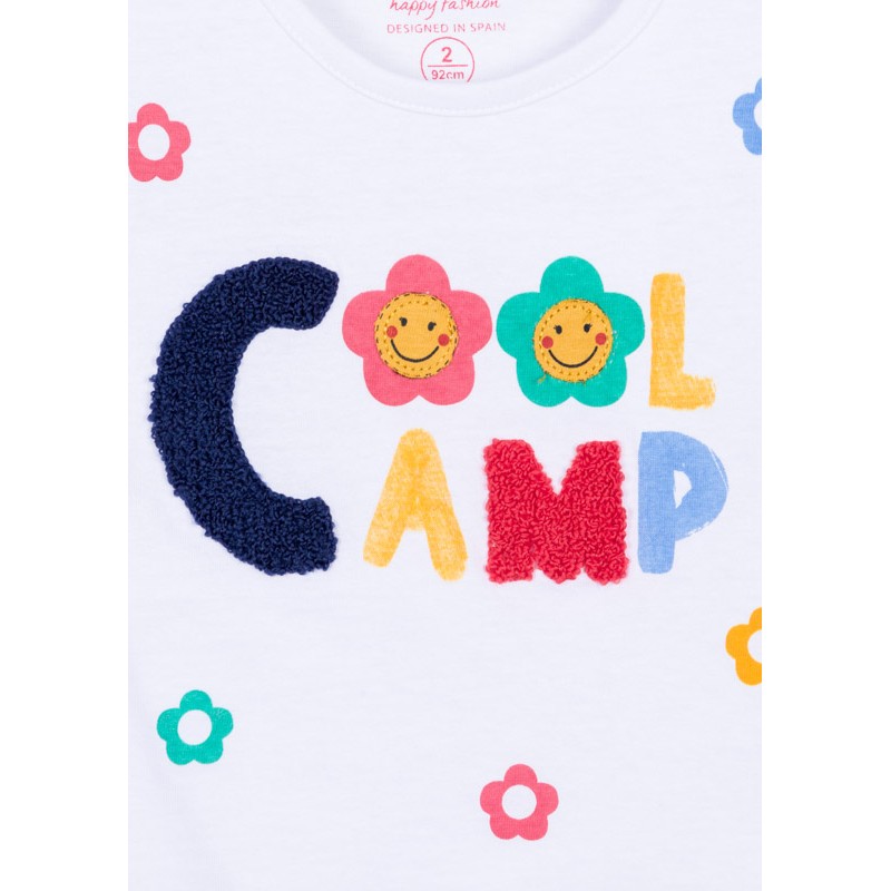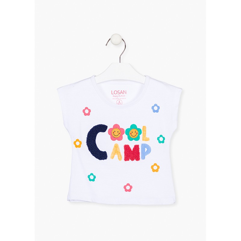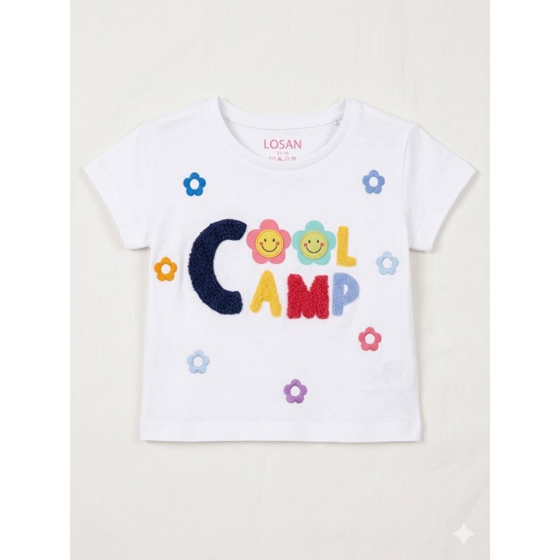 Camiseta con parches de rizo para niña. Camiseta de color blanco en tejido de algodón de manga corta. Mensaje y florecitas estampadas en el delantero.