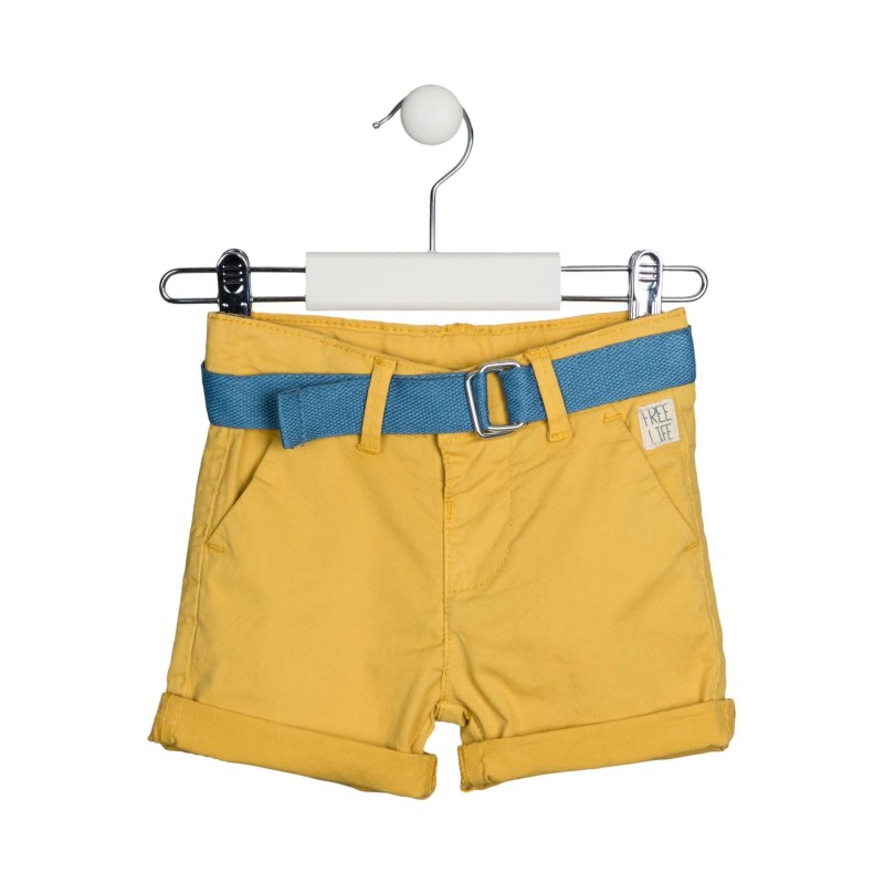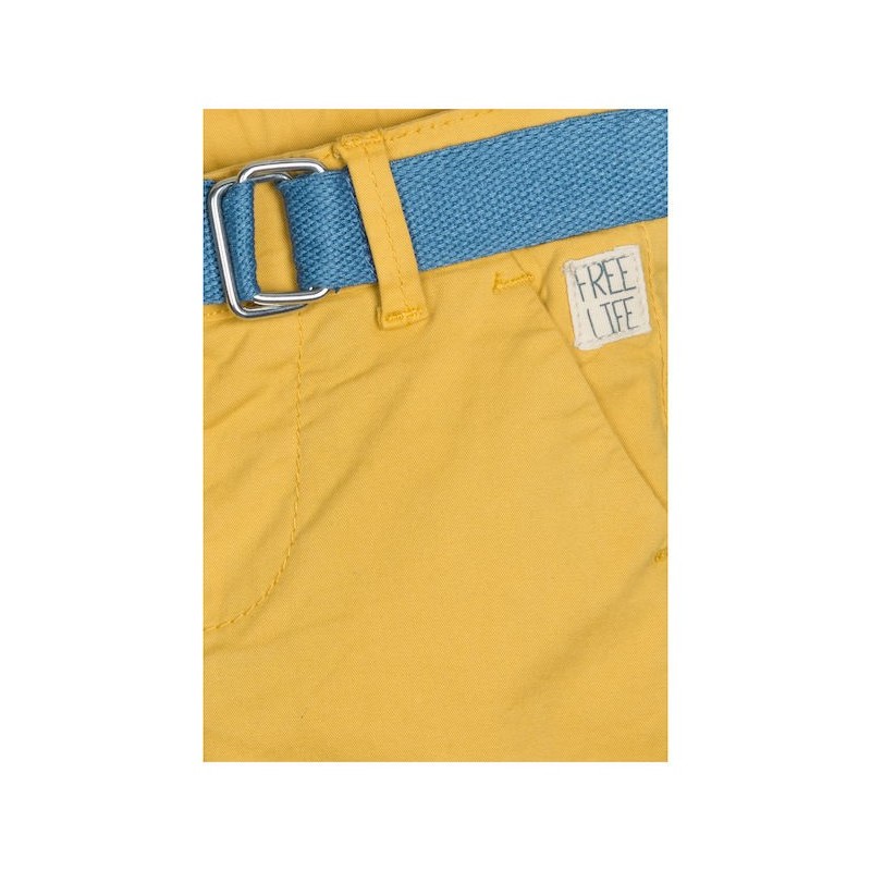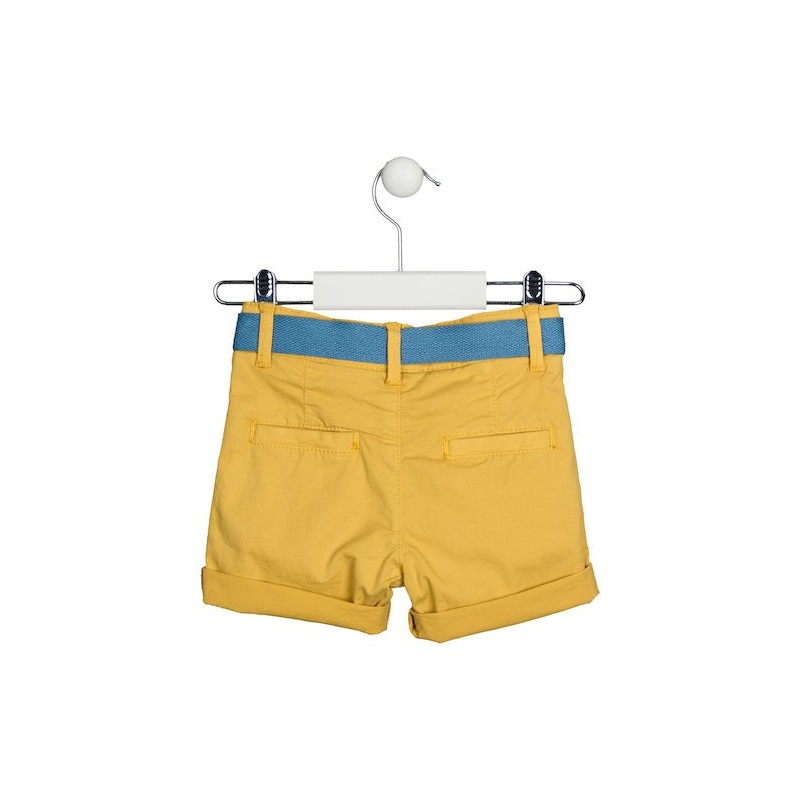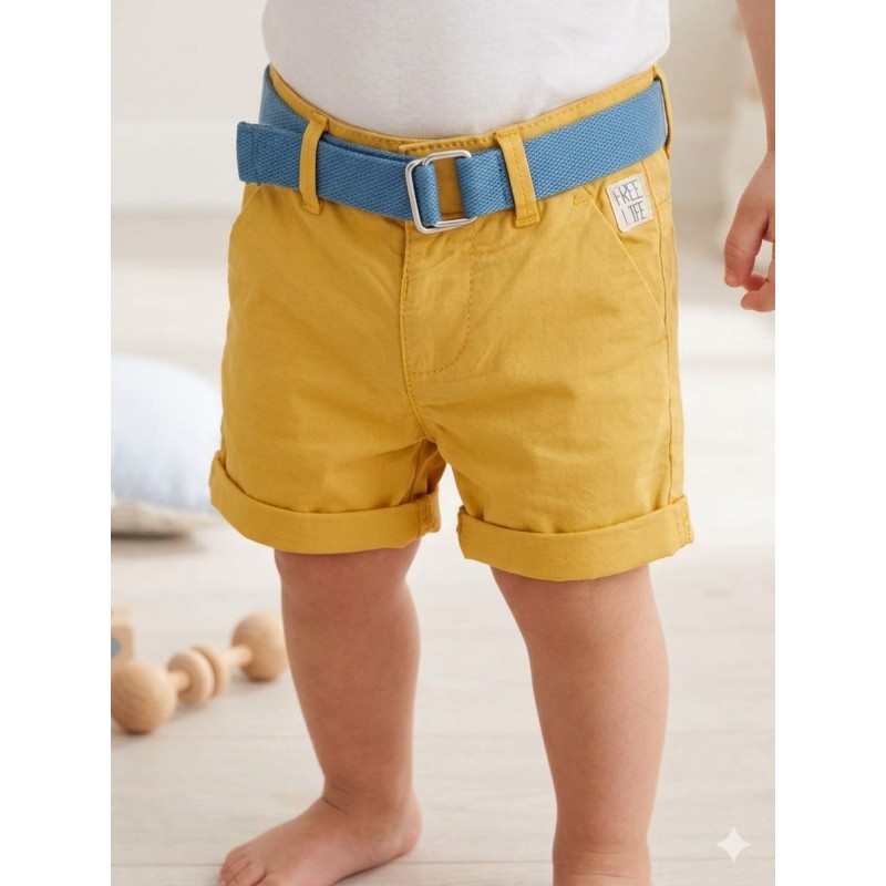 Bermuda en color mostaza con parches para bebé niño. Bermuda con doble en bajos, con bolsillos de ojal en el delantero y trasero. Con abertura en cintura, Goma ajustadora en el interior de la cintura con cinturon
