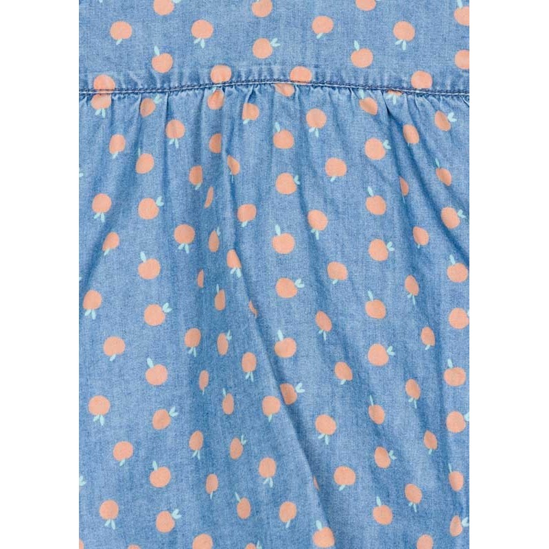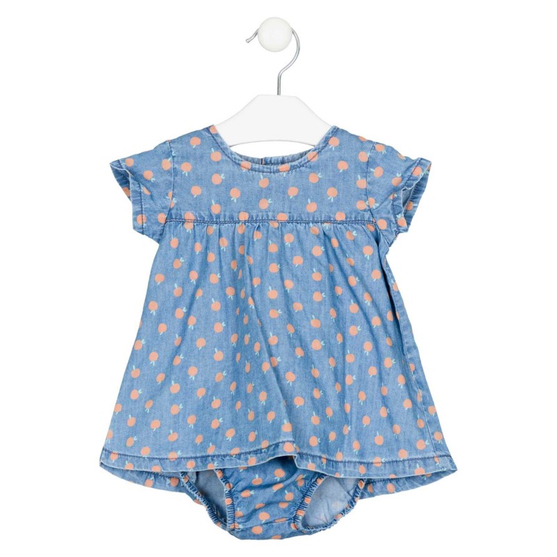 Vestido vaquero de manga corta con braguita para bebé niña. Vestido vaquero con bordados,Cuello redondo. Abertura total en la espalda con automáticos.