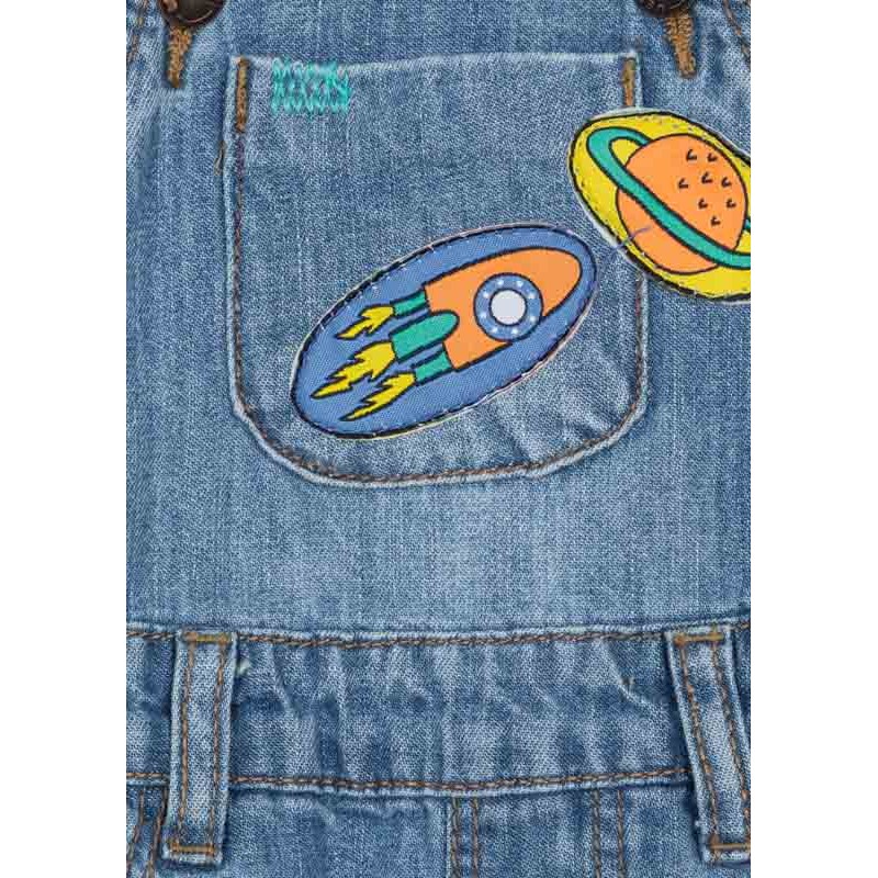 Overol , braga para niño en denim suave, con estampados de cohetes.