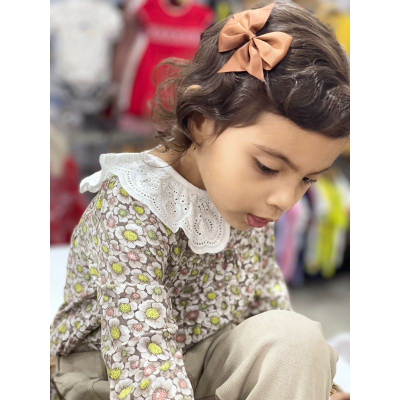 Blusa de manga larga para niña con puños elásticos. Cuello bordado. Pequeña abertura en la espalda con cierre de botón para facilitar la puesta de la prenda.