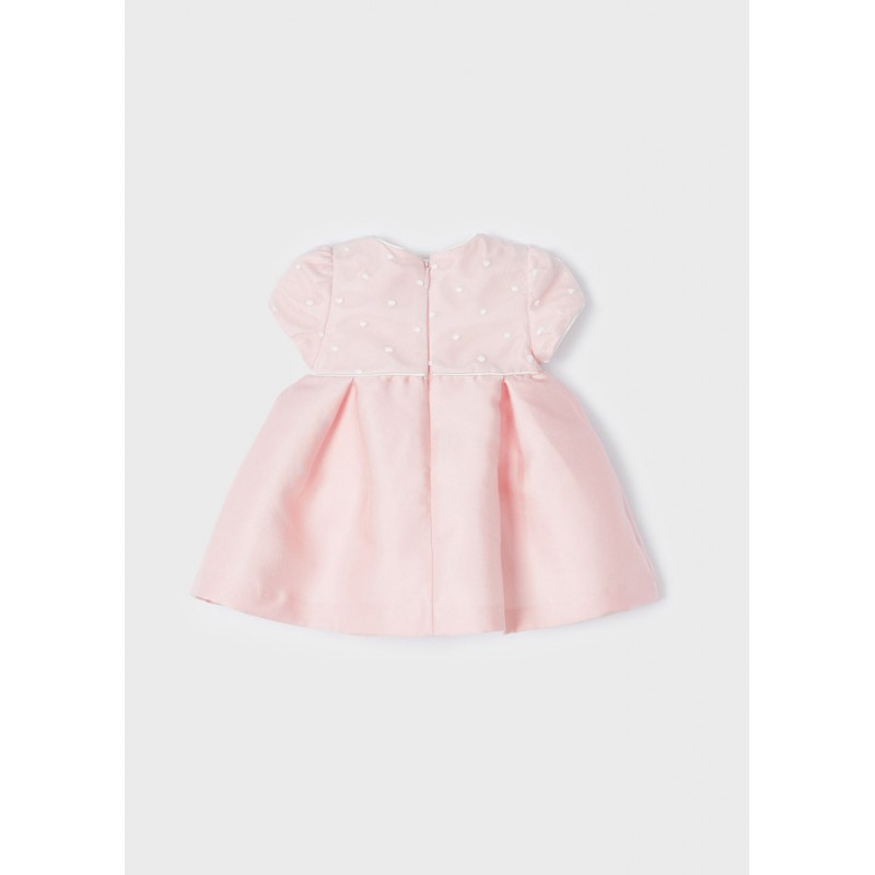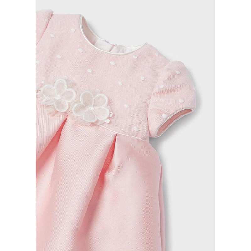 Vestido de manga corta para recién nacido. Cuello redondo. Cierre con cremallera en la parte trasera para una puesta ágil y rápida. Elementos de adorno: apliques florales.