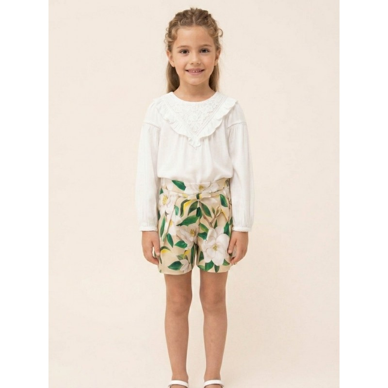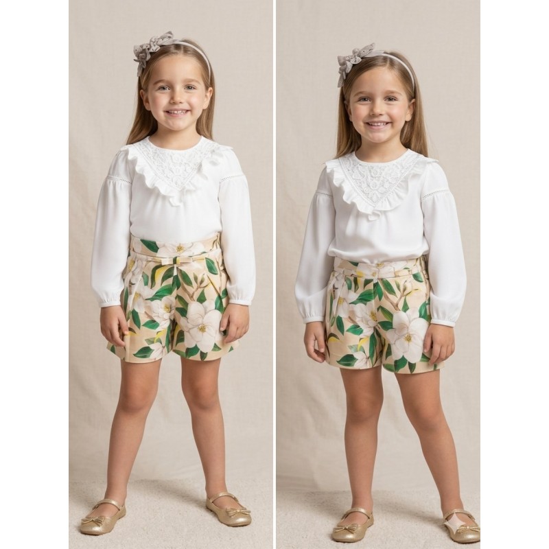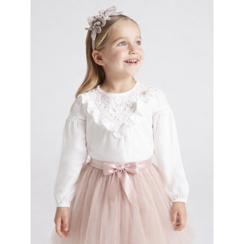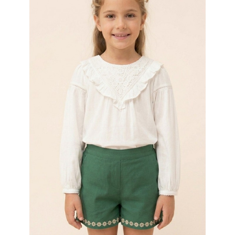 Blusa de manga larga para niña con puños elásticos. Pequeña abertura en la espalda con cierre de botón para facilitar la puesta de la prenda.