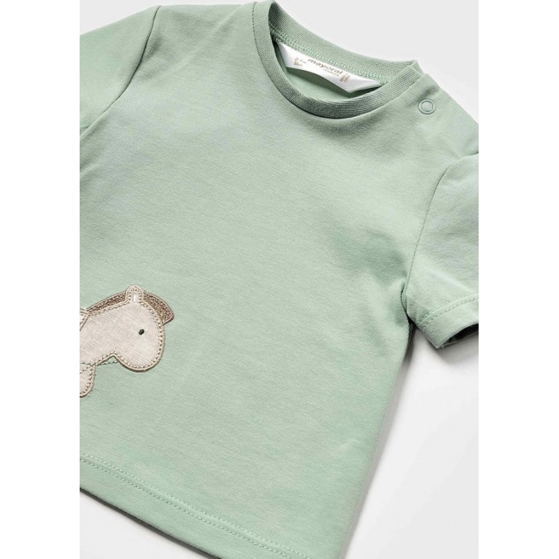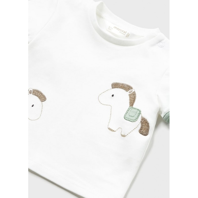 Camiseta de manga corta para recién nacido. Cierre con botones en el hombro. Diseño con delicados motivos infantiles.