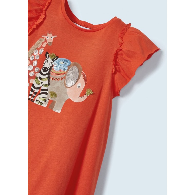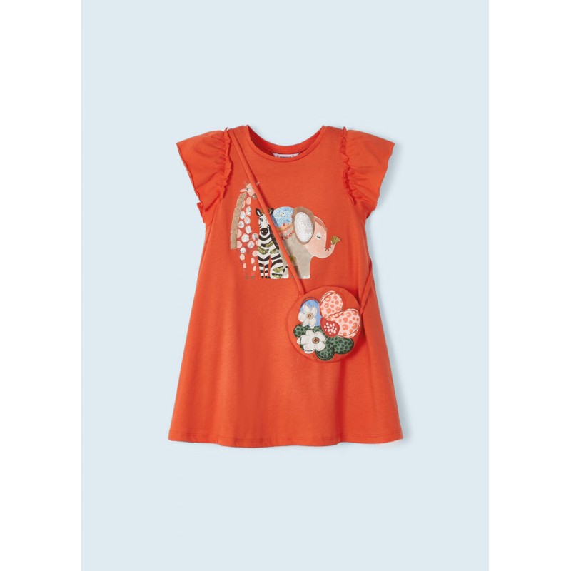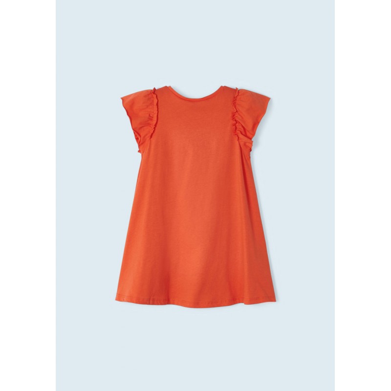 Vestido de manga corta para niña con detalles de volantes. Cuello redondo. Tejido 100% algodón. Diseño estampado.