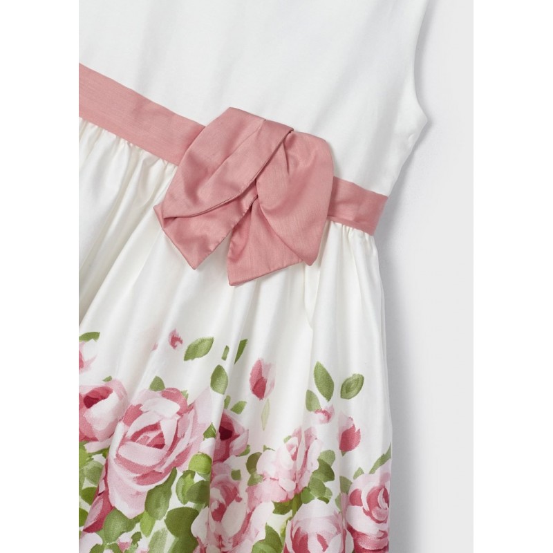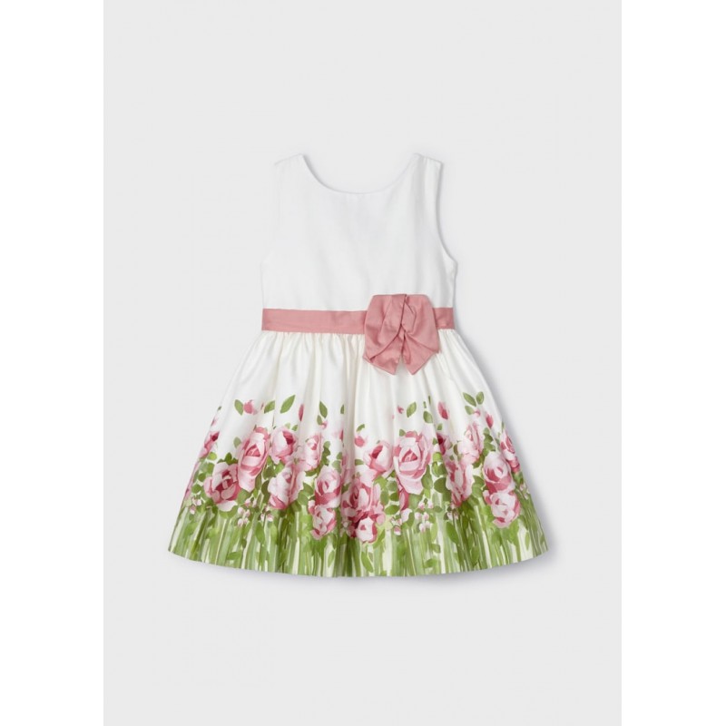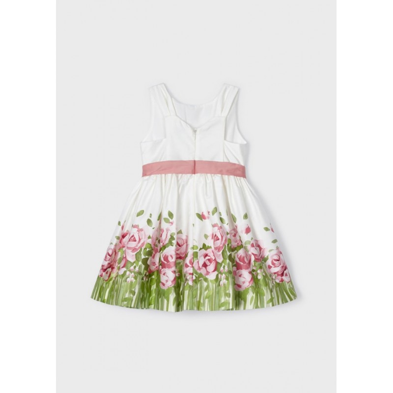 Vestido de tirantes para niña. Cuello redondo. Cierre con cremallera en la parte trasera para una puesta ágil y rápida. Tejido 100% algodón. Elementos de adorno: apliques de lazos. Estampado con decoración floral.
