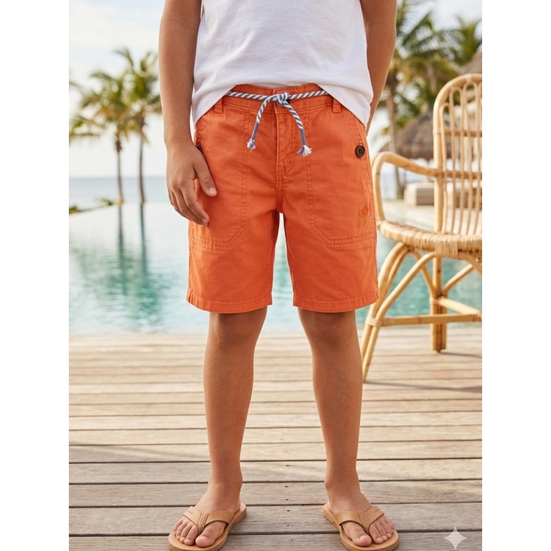 Prenda ECOFRIENDS, contiene algodón sostenible. Pantalón de tipo bermuda para niño. Cierre con cremallera y botón. Cintura con cordón ajustable. Bolsillos funcionales en el delantero y en la parte trasera de la prenda. Por motivos de seguridad, las tallas pequeñas (2-5 años) no llevarán cremallera en la bragueta, sino que será simulada.