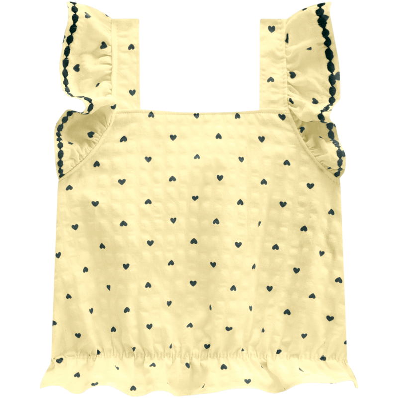 CONJUNTO NIÑA BLUSA EN LINO AMARILLO CON CORAZONES AZUL Y SHORT