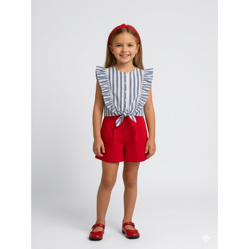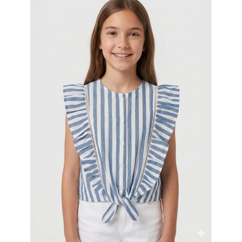 Blusón sin mangas para niña. Cuello redondo. Cierre con botones en la parte delantera. Tejido 100% algodón. Elementos de adorno: aplique de lazo. Motivo de rayas.