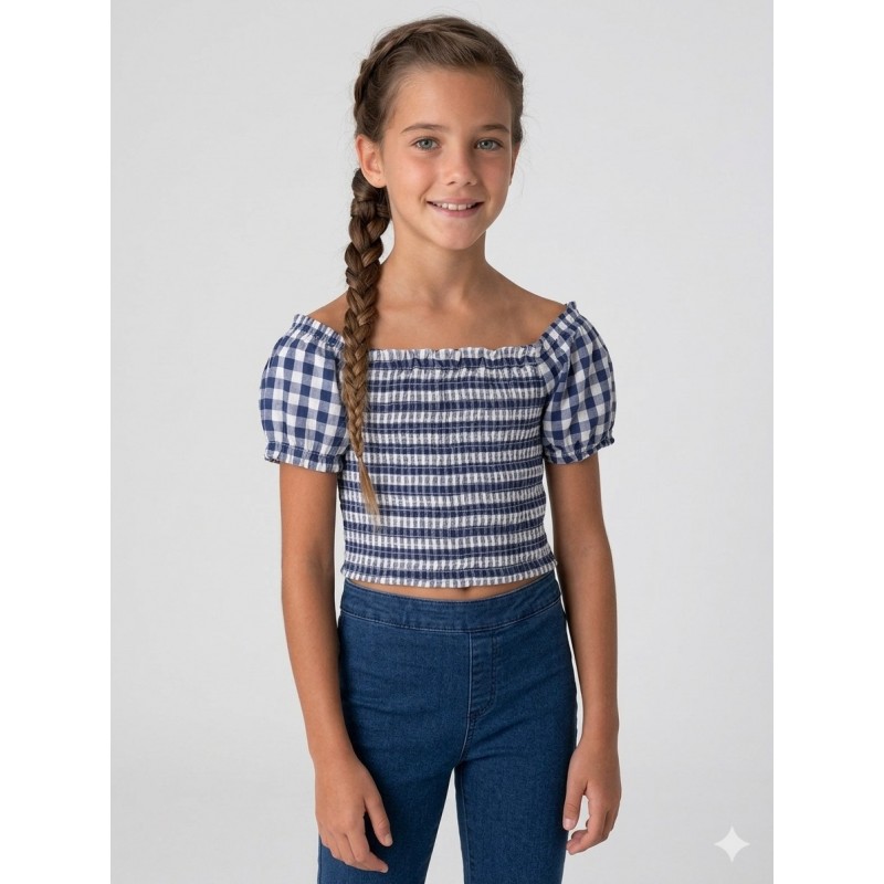 Blusón de manga corta para chica. Cuello cuadrado. Tejido 100% algodón.