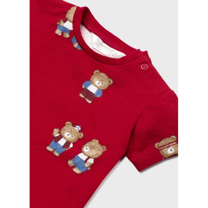 Camiseta de manga corta para recién nacido. Cuello redondo. Cierre con botones en el hombro. Diseño con delicados motivos infantiles.