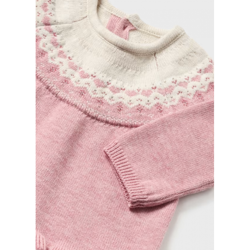 Jersey de manga larga para recién nacido. Cierre con botones en la espalda para facilitar la puesta de la prenda. Diseño con volante decorativo en el bajo de la prenda. Dibujos en punto jacquard.