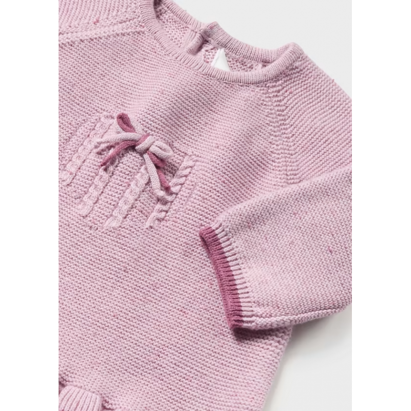 Jersey de manga larga para recién nacido. Cierre con botones en la espalda para facilitar la puesta de la prenda. Diseño con volante decorativo en el bajo de la prenda. Dibujos en punto jacquard.