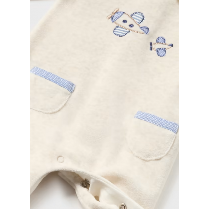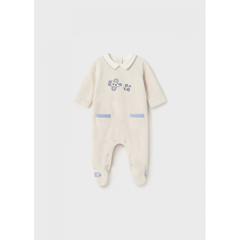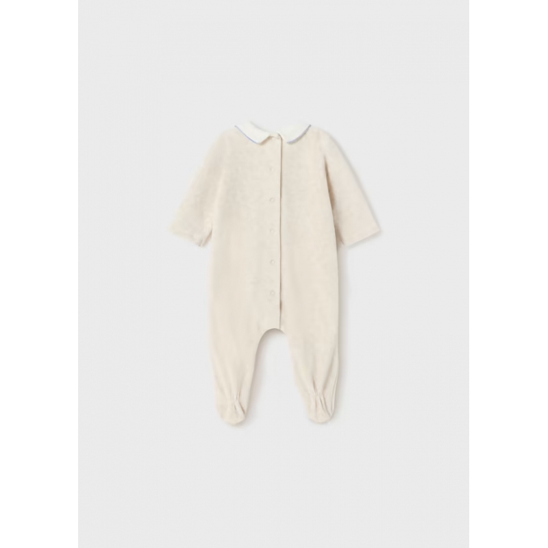 Pijama de manga larga para recién nacido. Cuello bebé. Cierre con botones a presión en la parte posterior. Cierre con botones a presión en la entrepierna para facilitar la puesta de la prenda. Cálido tejido de algodón con tacto suave y aterciopelado. Elementos de adorno: aplique decorativo.