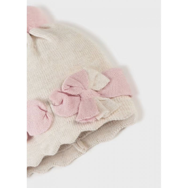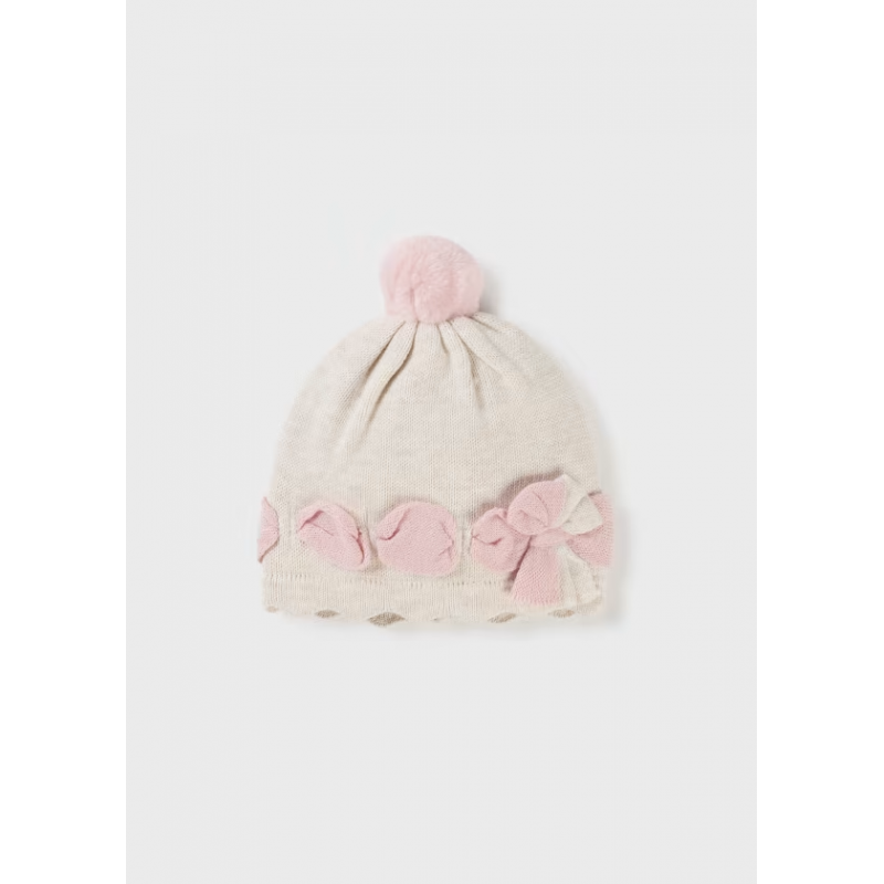 Dulce gorro para recién nacido. Tejido 100% algodón. Elementos de adorno: lazo, pompón.