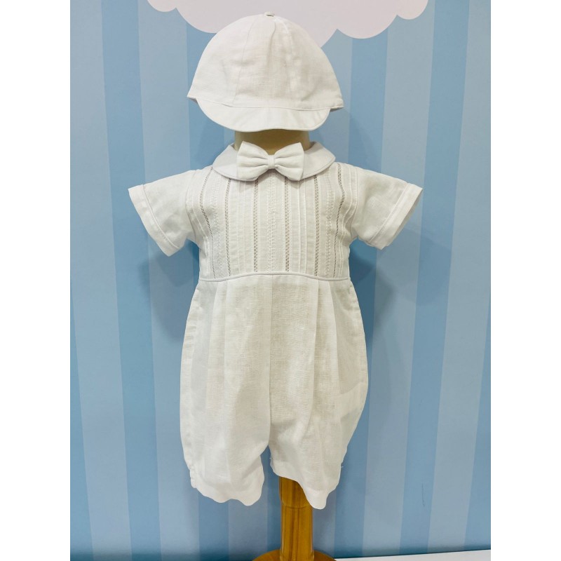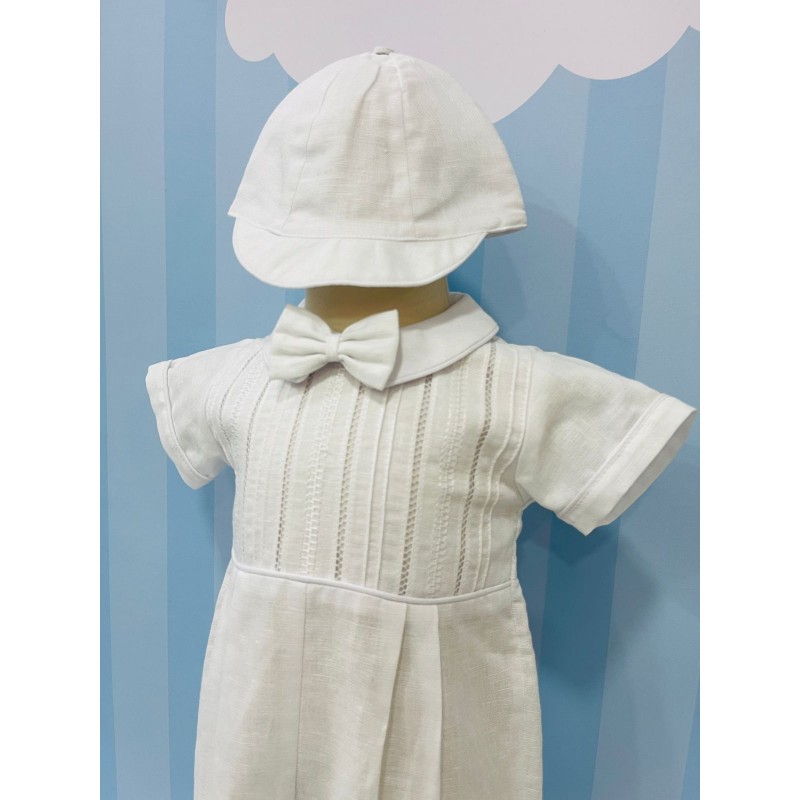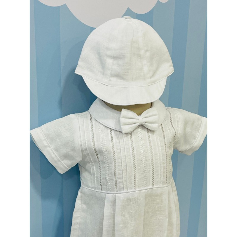 Tierno mameluco ideal para ocasiones especiales. Elaborado en fino lino. Incluye gorro.