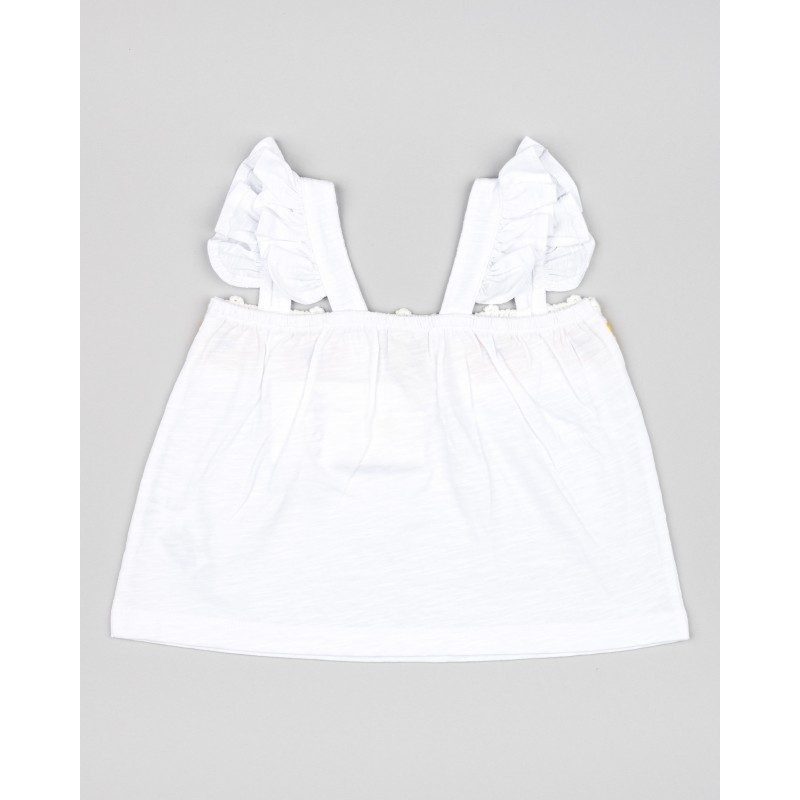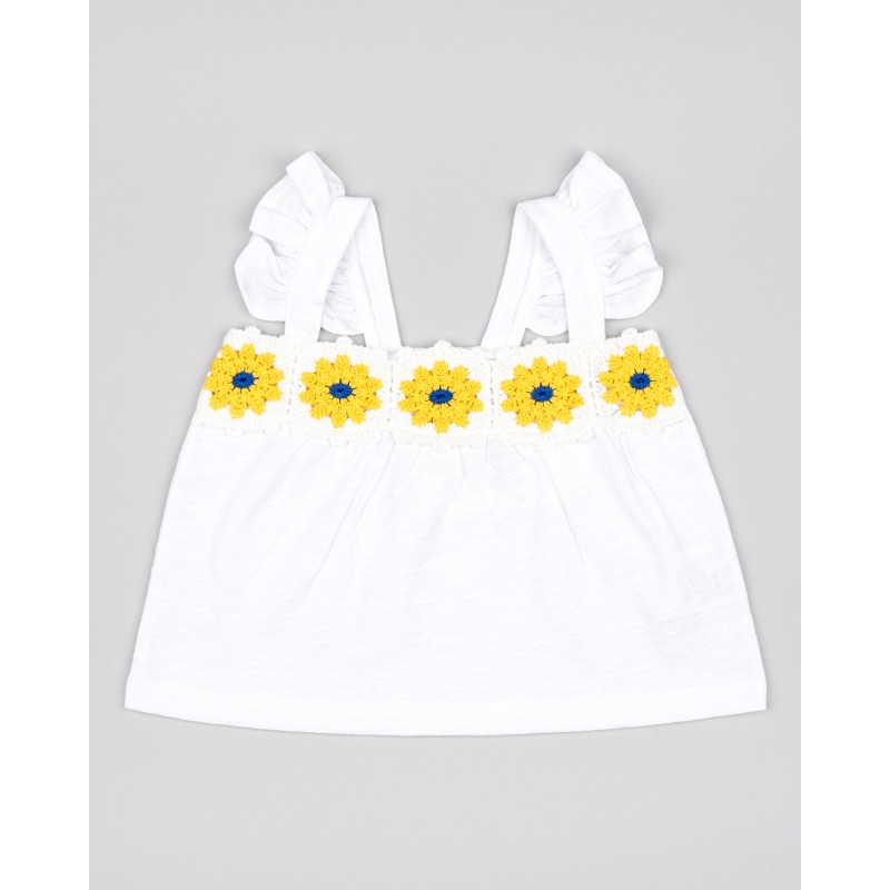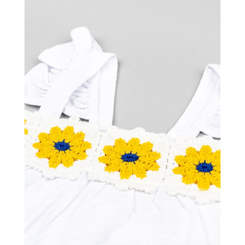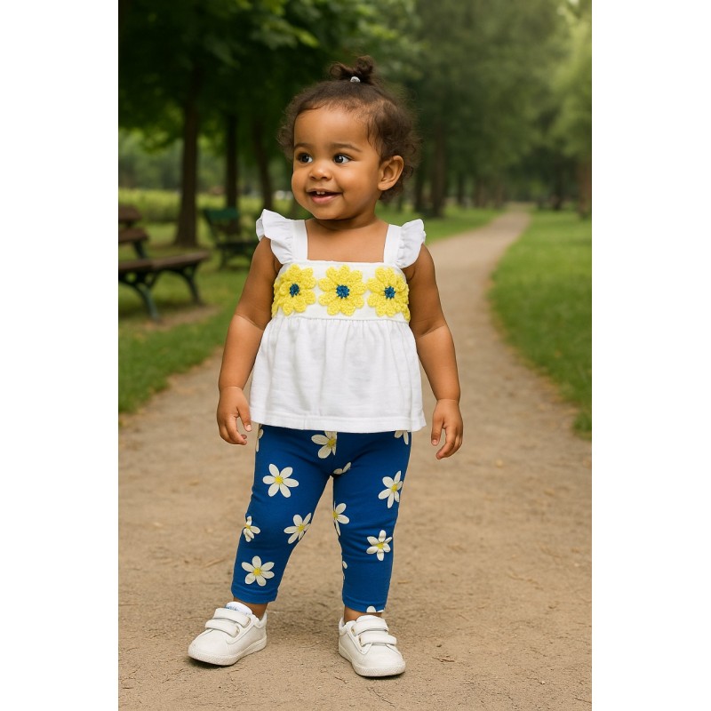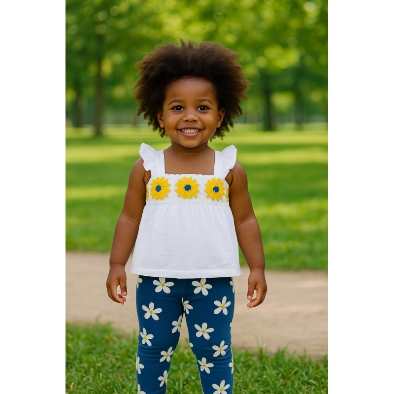 CONJUNTO BLUSA CORTA CON FLORES AMARILLAS TEJIDAS Y LEGGINS ESTAMPADO