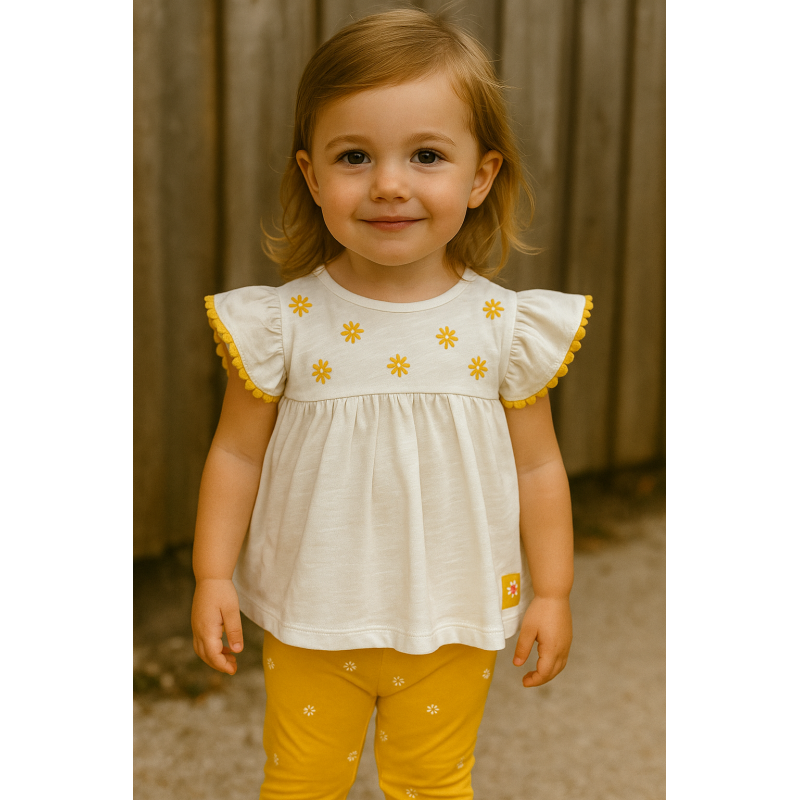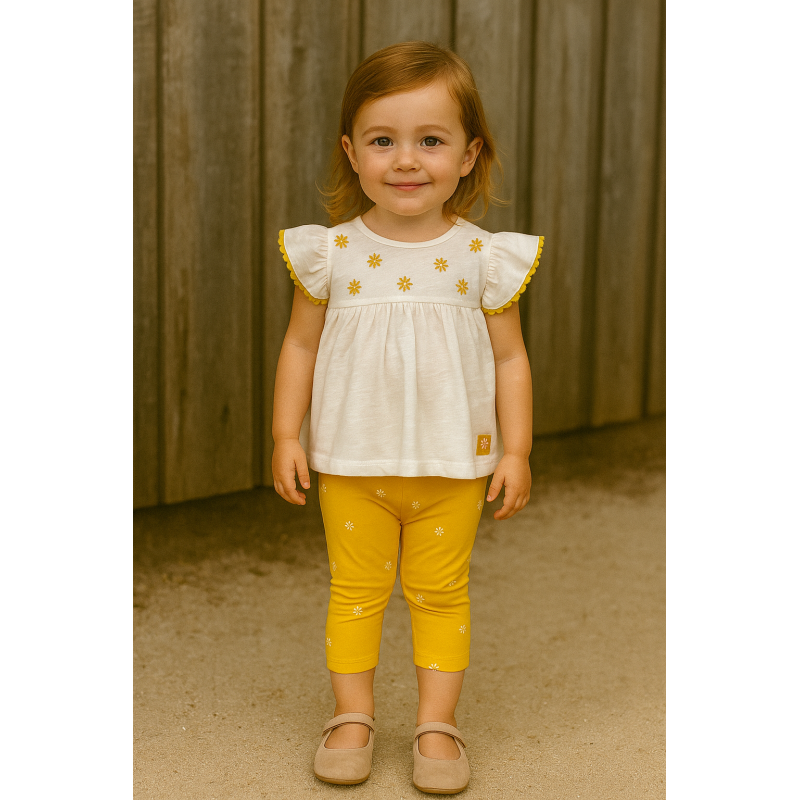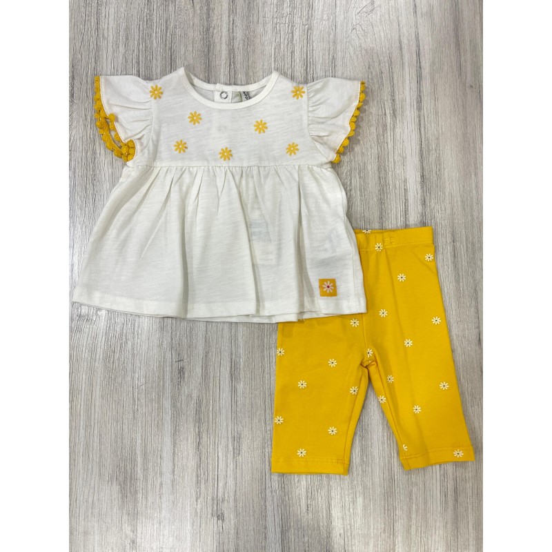 BLUSA TIPO CAMPESINA ESTAMPADA DE FLORES AMARILLAS Y LEGGINS AMARILLO