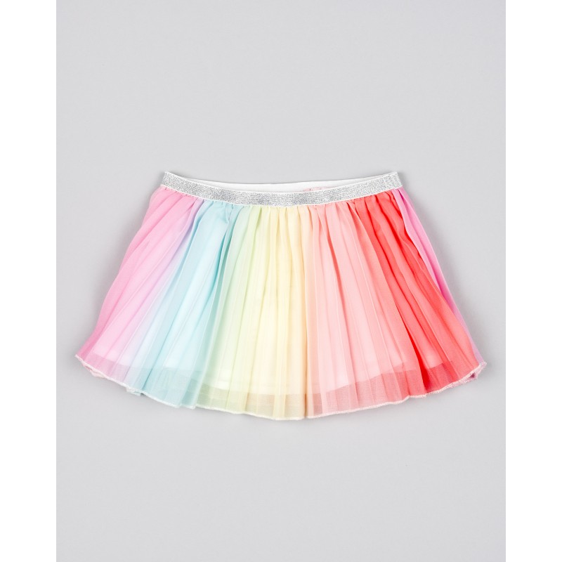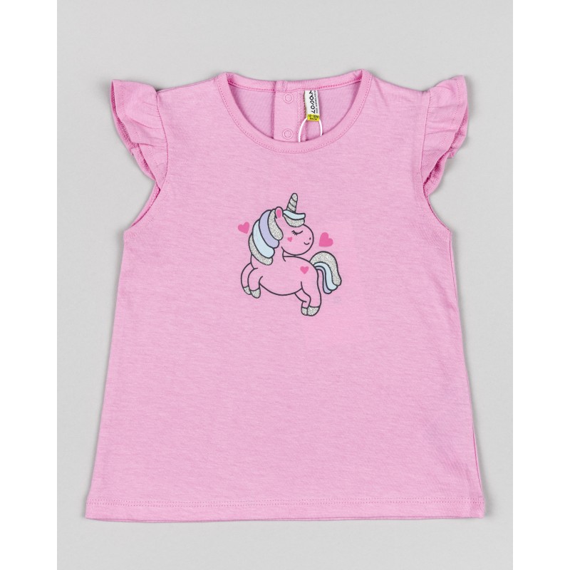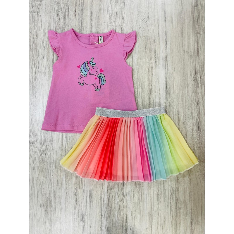 CONJUNTO BABY NIÑA BLUSA ROSADA CON ESTAMPADO DE UNICORNIO Y FALDA PLIZADA DE ARCOIRIS