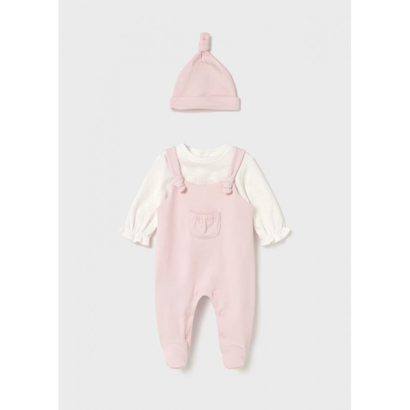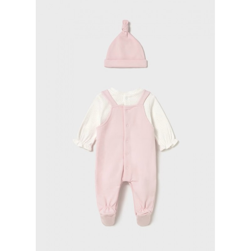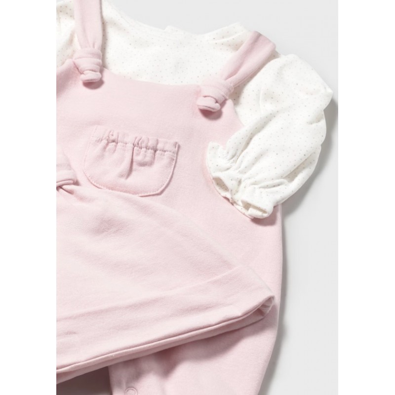 Pelele de manga larga para recién nacido con puños elásticos en el interior. Diseño con peto simulado en superposición. Cierre con botones a presión en la parte posterior. Botones a presión en la entrepierna para facilitar la puesta de la prenda