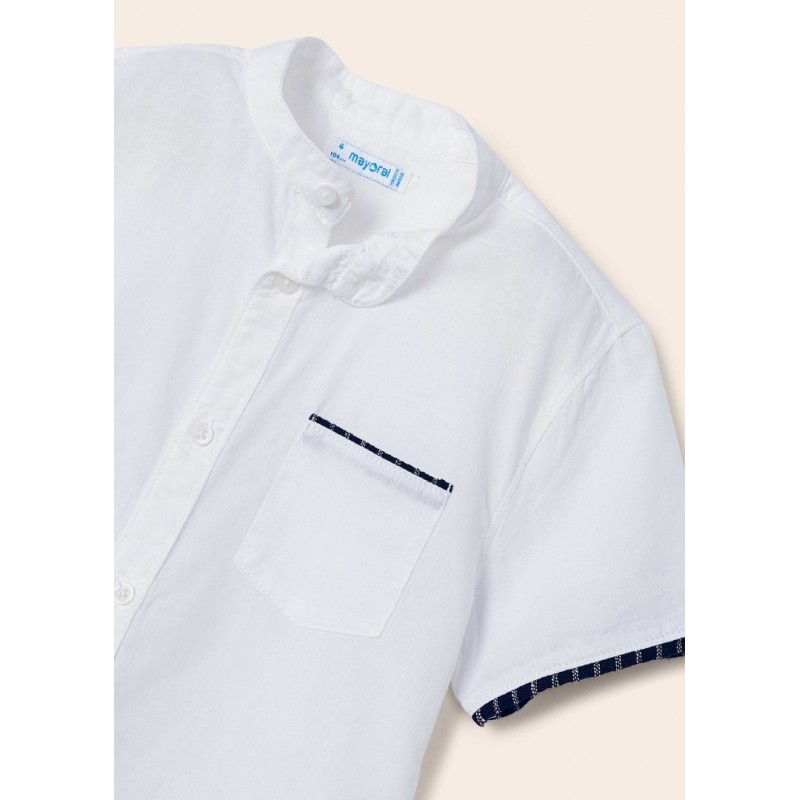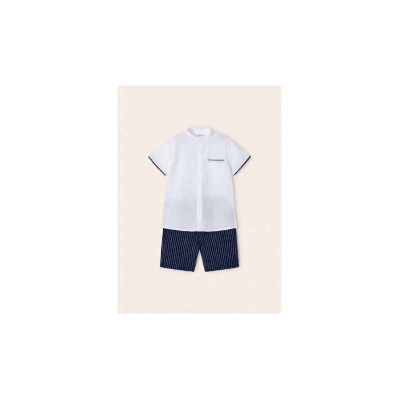 Conjunto de camisa y bermudas. Camisa de manga corta para niño. Modelo con cuello mao al tono. Tejido de aspecto fresco y actual con lino. Bolsillo funcional en la parte delantera.Cierre con cremallera y botón. Cintura con cordón interior ajustable. Bolsillos funcionales. Por motivos de seguridad, las tallas pequeñas (2-5 años) no llevarán cremallera en la bragueta, sino que será simulada.