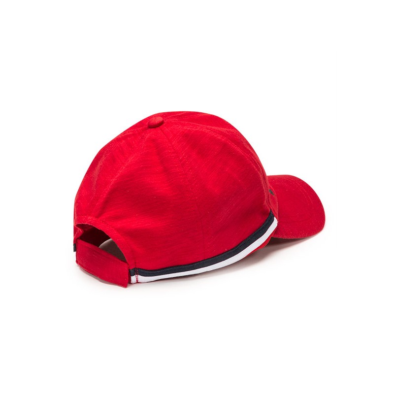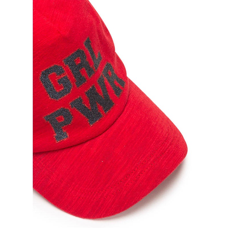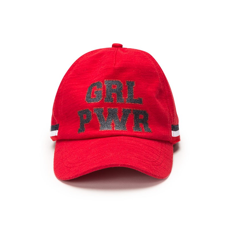 Gorra de punto de color rojo para chica. Gorra con mensaje delantero estampado de purpurina. Ajustador de velcro en la parte posterior. Cintas de rayas en los laterales.