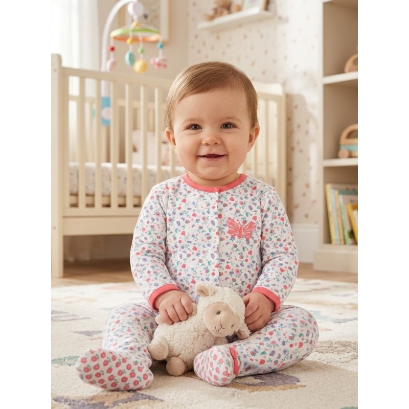 Pijama con de color blanco con estampado de flores para bebé niña. Pijama manga larga con estampado de mariposa en pecho y estampado engomado en pies. Vivo en cuello y puños a contraste en color rosa. Abertura delantera y en entrepierna con cierres automáticos. Presentado en caja regalo.