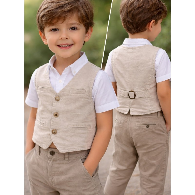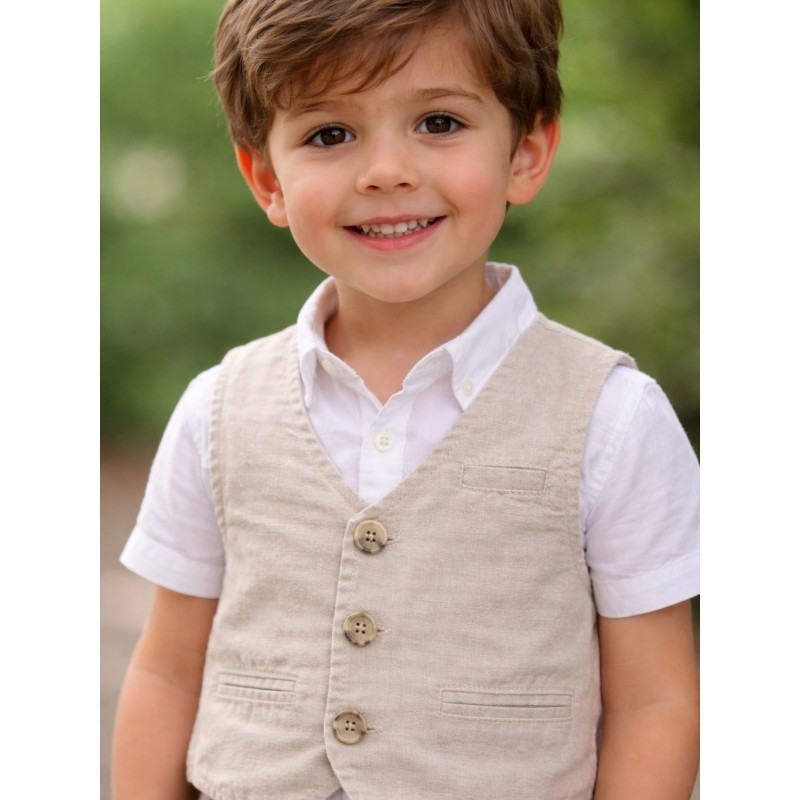 Chaleco de color piedra en lino para bebé niño. Chaleco de color piedra en lino. Botones frontales. Falsos bolsillos delanteros y en el pecho. Hebilla de ajuste trasera.