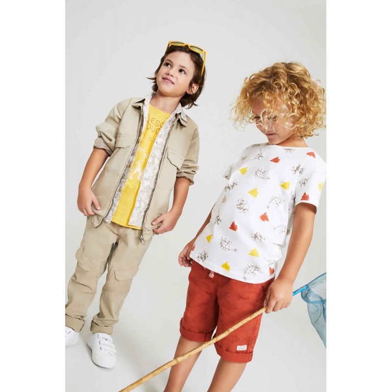 Bermuda para niño de 2 a 9 años. Cintura con goma elástica y cierre con botón. Tejido 100% algodón. Bolsillos funcionales en el delantero y en la parte trasera de la prenda. Por motivos de seguridad, las tallas pequeñas (2-5 años) no llevarán cremallera en la bragueta, sino que será simulada.