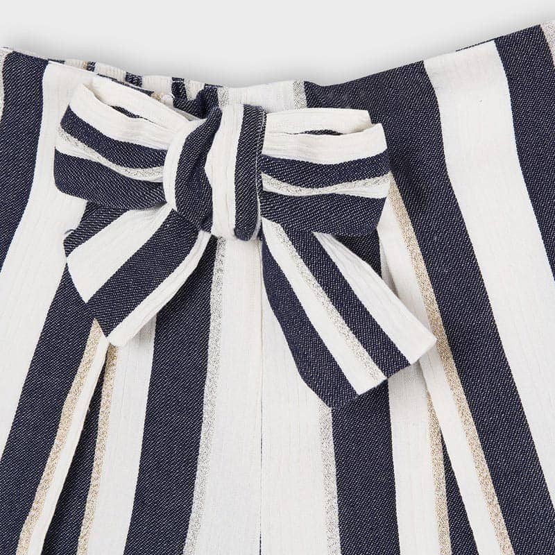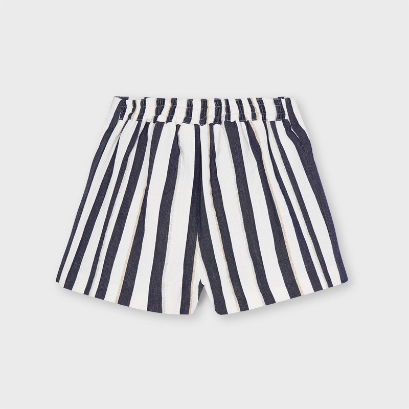 Prenda ECOFRIENDS contiene poliester reciclado. Pantalón de tipo short para niña de 2 a 9 años. Goma elástica en la cintura para un mejor ajuste. Tejido fluido y elástico para una máxima comodidad en el día a día. Elementos de adorno: aplique de lazo. Motivo de rayas..