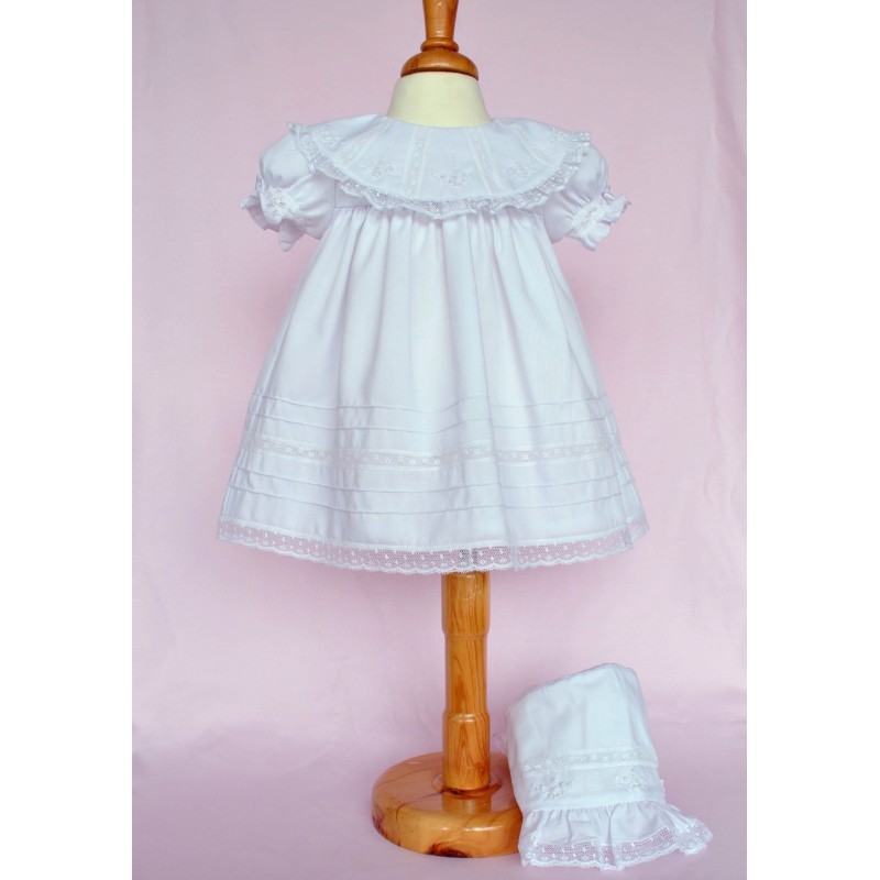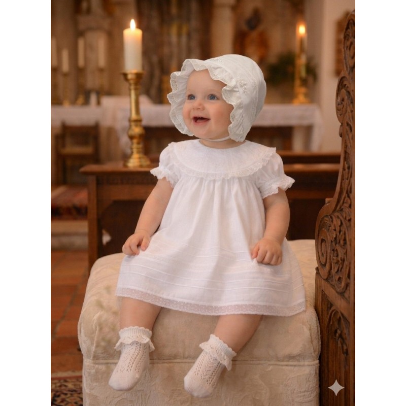 Tierno y delicado vestido para niñas, ideal para ocasiones especiales. Delicados y tradicionales detalles bordados a mano. Frescas y delicadas telas. 100% Algodón. Incluye capota o gorro ceremonial y short interior.