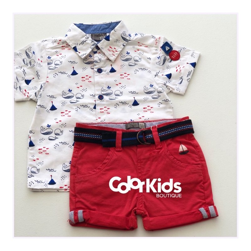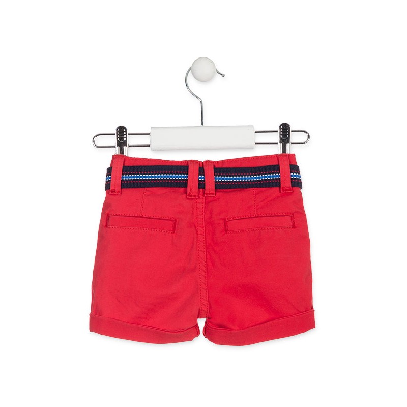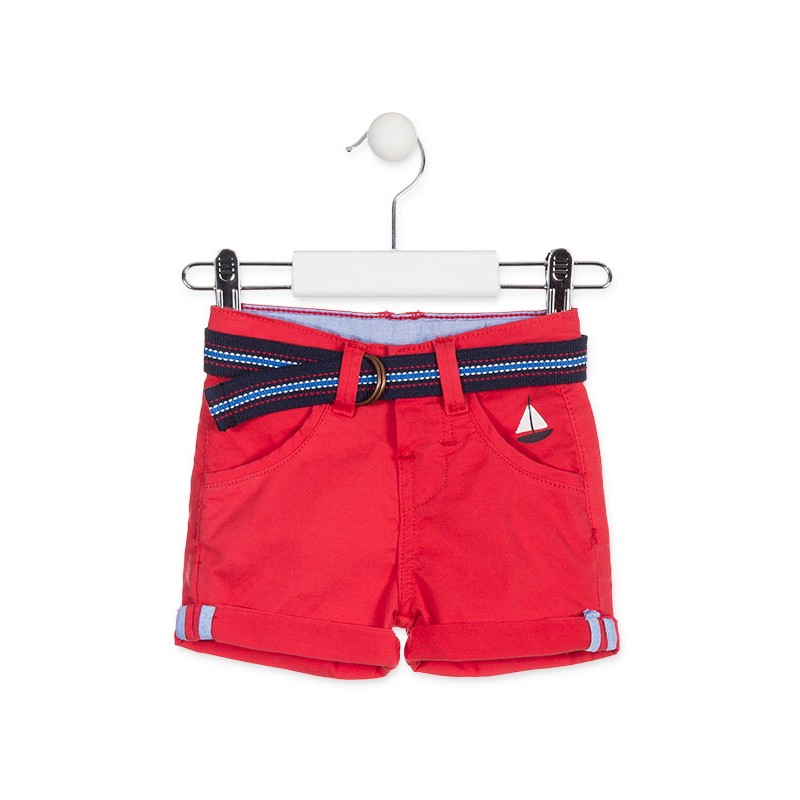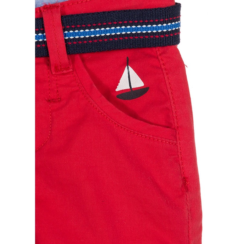 Bermuda de color rojo con cinturón para bebé niño. Bermuda con vuelta en el bajo. Barquito estampado en el bolsillo. Abertura con automático oculto, trabillas en la cintura y ajustador interior de goma. Cintura interior y piezas de la vuelta en tejido de camisería. Bolsillos traseros de ojal .