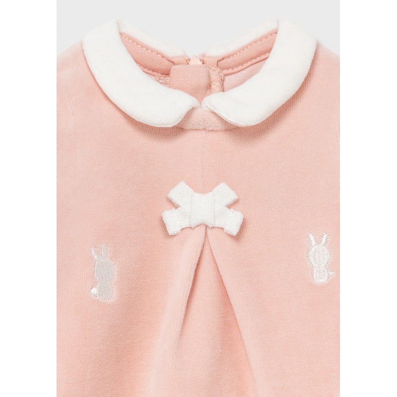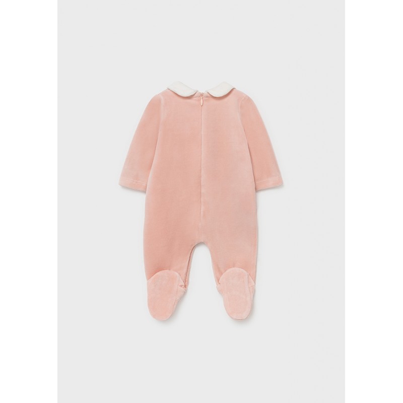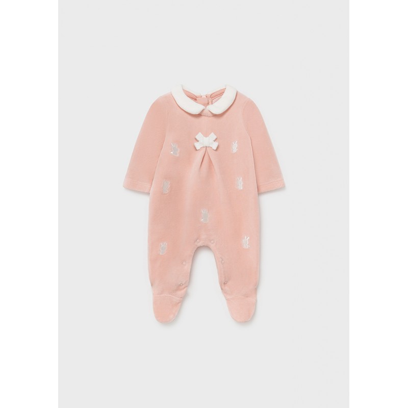Pijama manga larga para recién nacida niña. Diseño con pies. Cuello camisero. Cierre con botones a presión en la entrepierna. Cierre con cremallera. Elementos de adorno: lazada decorativa.